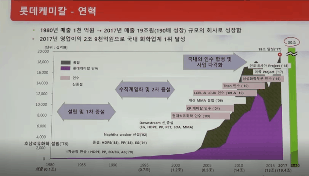 롯데그룹은 식품사업을 시작으로 창립해 현재 5개 사업부문 91개 계열사를 운영하고 있다. 유통, 화학/건설, 관광/서비스, 금융 부문 등의 사업 포트폴리오를 구축했다. 화학/건설 부분은 17개 회사로 2017년 기준 매출 26조원을 기록해 전체 그룹사 전체 매출 비중은 32% 정도를 차지할 정도로 핵심 사업이다. 국내 탄탄한 생산거점을 바탕으로 연간 280만 톤의 에틸렌을 생산하고 있다.