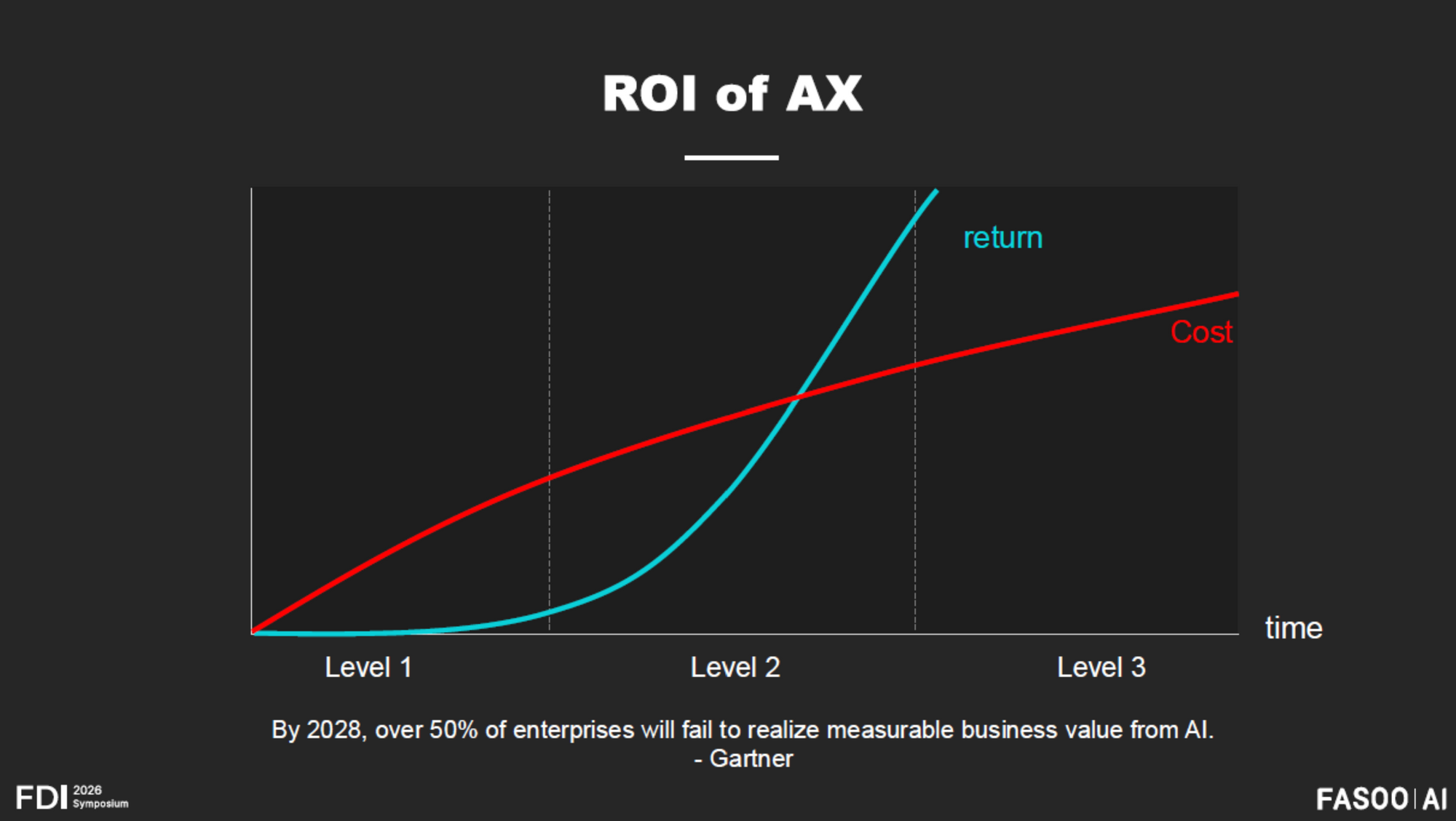 핵심 문제 진단은 첫 번째 단계의 구조적 한계에서 출발한다. AI 어시스턴트 덕분에 개인 생산성이 높아졌다고 느끼는 직원이 늘더라도, 그 시간에 새로운 일을 맡지 않으면 기업 전체의 생산량은 늘지 않는다. AI에 투자하고도 비용 대비 수익(ROI)이 체감되지 않는 이유가 여기에 있다. 시장조사기관 가트너(Gartner)는 2028년까지 기업의 50%가 AI 투자에서 실질적 가치 실현에 실패할 것이라고 전망한 바 있다. 조 대표는 이 수치의 배경으로 어시스턴트 단계 고착화를 지목했다.