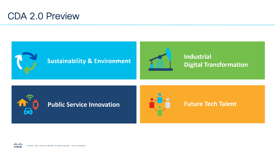 한편, CDA 2.0 프로젝트도 추진할 예정이다. 시스코는 지속가능과 환경, 산업용 디지털 전환, 공공 부문 혁신, 재생에너지, 스마트팩토리, 스타트업 중심으로 이를 추진한다.
