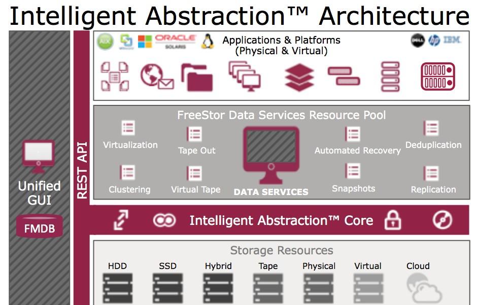 이제 기업들은 더 높은 수준의 가상화를 원합니다. 이를 팔콘스토어는 지능적 추상화(Intelligent Abstraction)이라 부릅니다. 지능적 추상화의 개념은 물리적인 스토리지 장치에 묶여 있던 애플리케이션, 데이터, 워크로드, 네트워크, 프로토콜을 분리하는 것입니다. 즉, 물리적 장치의 종류와 공급 업체에 얽메이지 않고 모든 이기종 장치를 하나의 단일 자원으로 묶고 이 위해 추상화 계층을 더하는 것입니다. 백업, 복구, 마이그레이션 등 모든 데이터 서비스는 추상화라는 새로운 서비스 계층을 통해 제공됩니다. 서버 가상화와 마찬 가지로 스토리지를 대상으로 한 지능적 추상화는 자원 활용도를 높이고 관리를 중앙집중화 합니다. 비용은? 물론 내려갑니다.