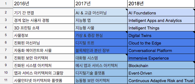 2011년부터 2018년까지 가트너, 전략기술 톱 10을 박스에 넣으려고 했는데 너무 작아서 안보일 거 같아서 아예 구글스프레드시트에 넣고 공유합니다.