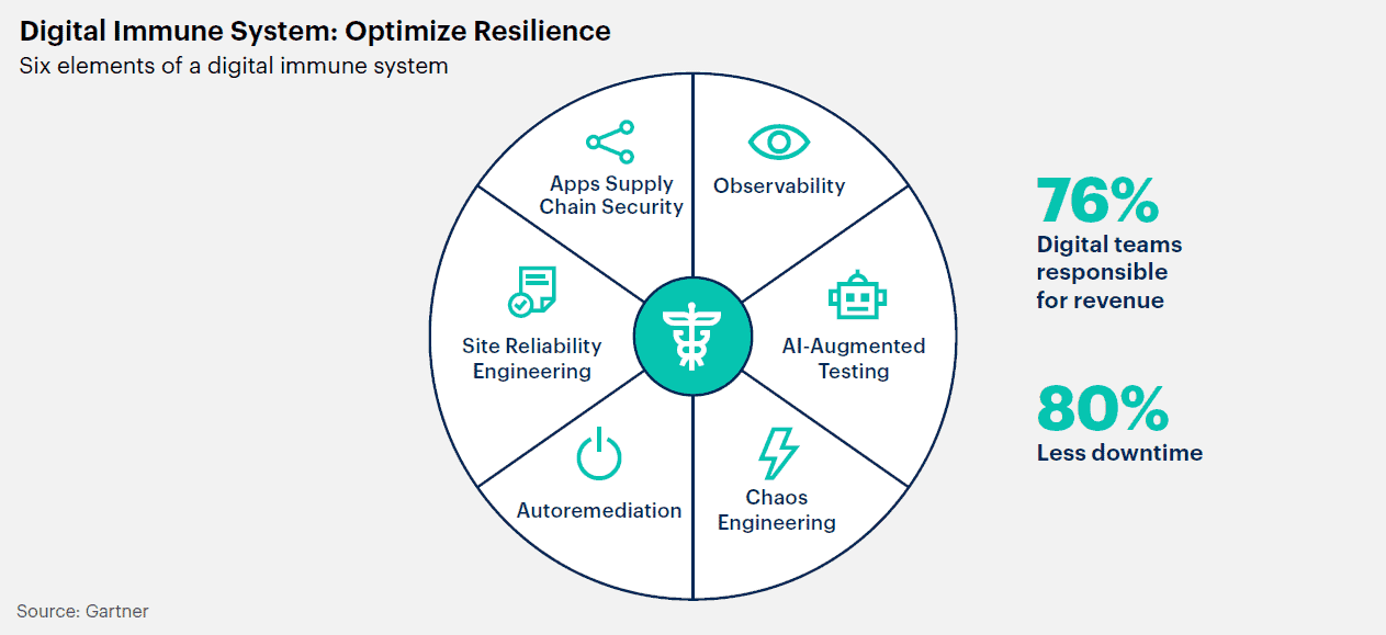 디지털 면역은 운영에 대한 데이터 기반의 인사이트, 자동화된 익스트림 테스팅(extreme testing), 자동화된 사건 해결, IT 운영 내 소프트웨어 엔지니어링 및 애플리케이션 공급망의 보안을 결합하여 시스템의 복원력과 안전성을 높인다. 가트너에 따르면, 2025년까지 디지털 면역 구축에 투자하는 기업은 시스템 다운타임을 최대 80%까지 감축할 수 있으며, 이는 곧 수익 증가로 이어질 것이다.