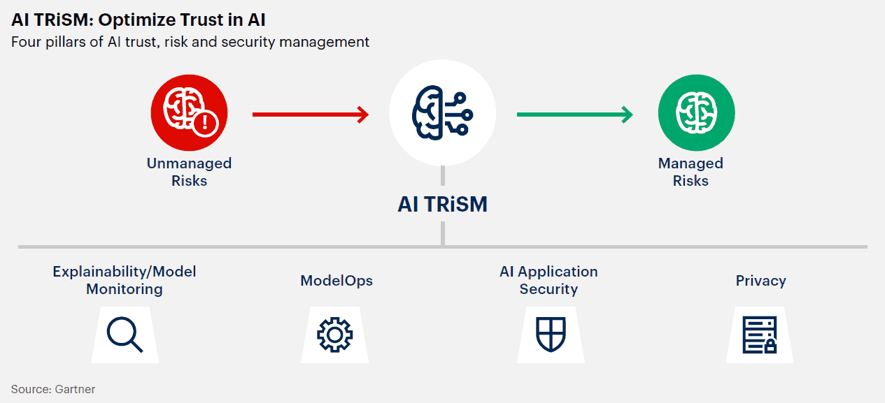 가트너는 조직이 모델의 안정성, 신뢰성, 보안 및 데이터 보호를 보장하기 위해 새로운 역량들을 도입할 것을 강조했다. AI 신뢰, 리스크 및 보안 관리(TRiSM)에 새로운 조치를 실행하기 위해서는 각기 다른 사업부 간의 협력이 필요하다.