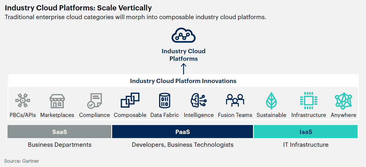 산업 클라우드 플랫폼은 서비스형 소프트웨어(SaaS), 서비스형 플랫폼(PaaS), 서비스형 인프라(IaaS)를 통합하여 특정 산업의 비즈니스 사용 사례를 지원하는 일련의 모듈식 기능을 제공한다. 기업은 산업 클라우드 플랫폼의 통합적 기능을 독특하고 차별화된 디지털 비즈니스 이니셔티브 구성요소로 사용함으로써 종속 현상을 방지하고 시장에 민첩성, 혁신 및 시간 절감 효과를 제공할 수 있다.