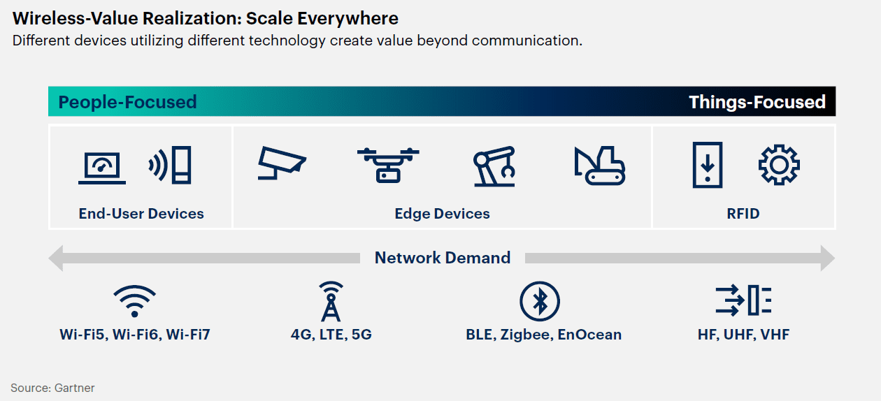 단일 기술이 시장을 독점하는 경우는 없겠으나 기업들은 모든 환경을 수용하기 위해 사무실 내의 와이파이, 모바일 디바이스 서비스, 저전력 서비스, 심지어 무선 연결에 이르는 다양한 무선 솔루션을 사용할 것이다. 가트너는 2025년까지 기업의 60%가 다섯 개 이상의 무선 기술을 동시에 사용할 것으로 예측한다.