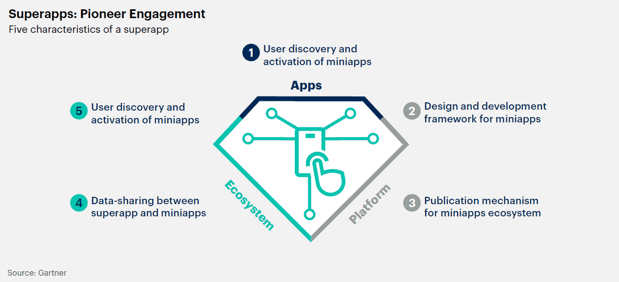 슈퍼앱은 앱, 플랫폼 및 생태계의 기능을 하나의 애플리케이션에 결합한다. 슈퍼앱은 자체적인 기능 집합체를 보유할 뿐만 아니라 써드파티에서 자체 미니 앱을 개발하고 배포할 수 있는 플랫폼을 제공한다. 가트너는 2027년까지 전 세계 인구의 50% 이상이 여러 슈퍼앱의 일일 활성 사용자가 될 것으로 예측한다.