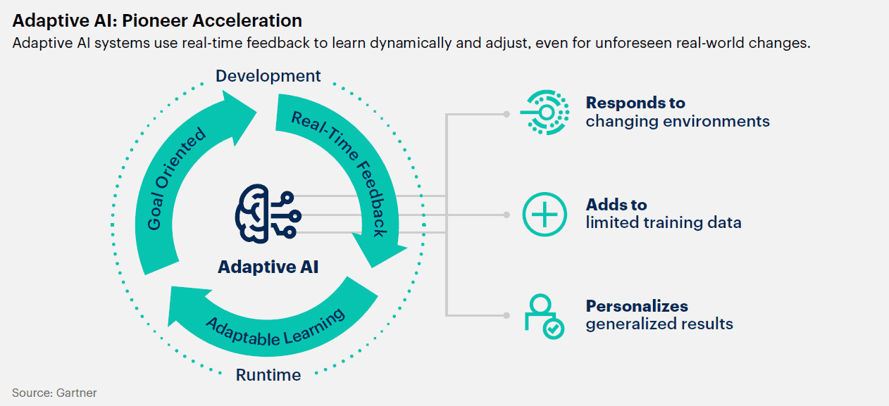 적응형 AI 시스템은 새로운 데이터를 기반으로 런타임 및 개발 환경 내에서 모델을 지속적으로 재교육하고 학습하여 초기 개발 단계 당시 존재하지 않았거나 예측 불가능한 실제 상황의 변화에 신속하게 적응하는 것을 목표로 한다. 적응형 AI 시스템은 실시간 피드백을 사용하여 학습을 동적으로 변경하고 목표를 조정한다. 따라서 외부 환경의 급격한 변화나 기업의 목표 변경에 최적화된 대응이 필요한 업무에 적합하다.