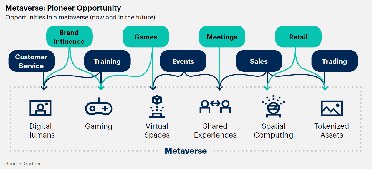 가트너는 메타버스를 가상으로 강화된 물리적 현실과 디지털 현실의 융합으로 생성된 집합적인 가상 3D 공유 공간으로 정의한다. 메타버스는 지속적이며 향상된 몰입 경험을 제공한다. 가트너는 완전한 메타버스가 디바이스로부터 독립적이며 단일 공급업체의 소유가 되지 않을 것으로 예상한다. 또한, 메타버스는 디지털 화폐와 대체불가능한토큰(NFT)으로 구현되는 자체적 가상 경제를 갖출 것이다. 가트너는 2027년까지 전 세계 대기업의 40% 이상이 수익 증대를 목표로 하는 메타버스 기반 프로젝트에서 웹3(Web3), AR 클라우드 및 디지털 트윈(digital twins)의 조합을 사용할 것으로 예측한다.
