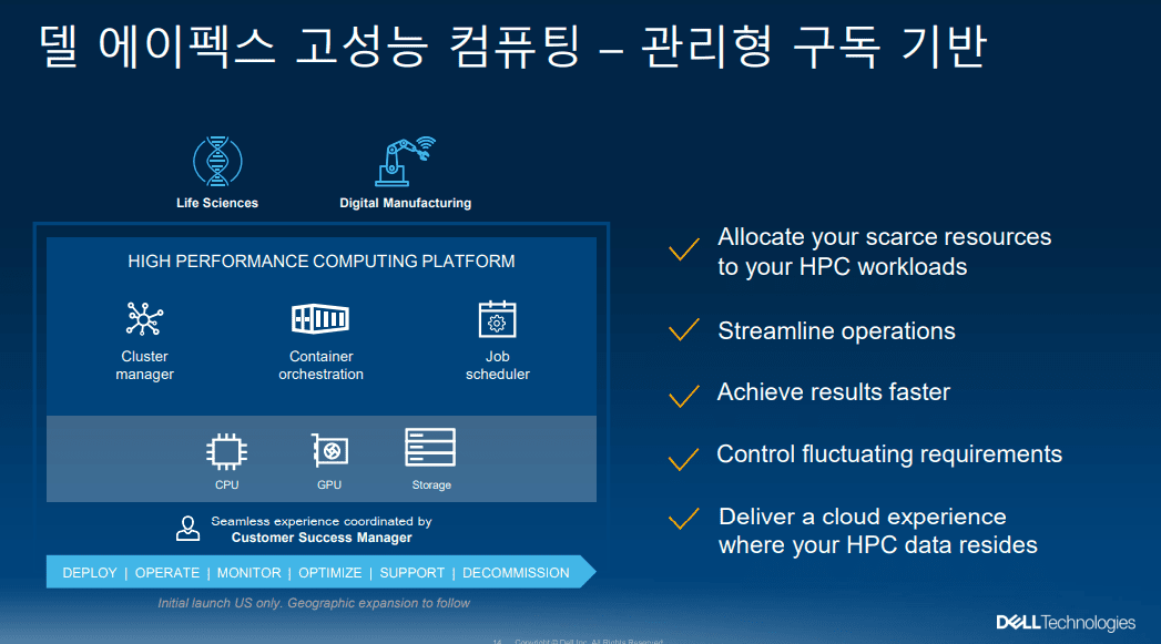 델 에이펙스 고성능 컴퓨팅은 HPC 클러스터 관리자, 컨테이너 오케스트레이터, 워크로드 관리자 및 HPC에 최적화된 기본 하드웨어 구성 등 HPC 워크로드를 실행하는 데 필요한 모든 것을 제공한다. 변화하는 워크로드 요구사항을 충족하고 더 빠른 결과를 실현하는 동시에 HPC 투자 효과를 극대화하는데 필요한 유연한 용량과 보안 기능을 1년, 3년 또는 5년 구독 형태로 사용할 수 있다.