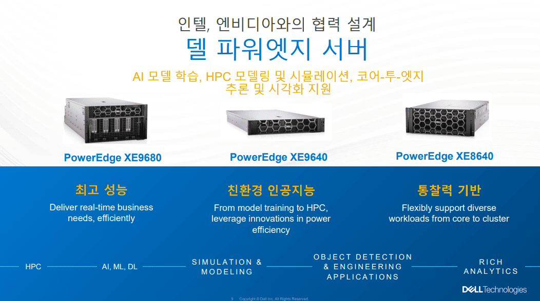 - 파워엣지XE9640(PowerEdge XE9640) – 성능 최적화를 위한 GPU 4개 탑재형의 2U 사이즈 파워엣지 서버로, 인텔 제온 프로세서 및 인텔 데이터센터 GPU 맥스 시리즈(Intel Data Center GPU Max Series)를 탑재했다. 다이렉트 리퀴드 쿨링(direct liquid cooling) 방식으로 랙 집적도를 높여 에너지 비용을 절감하도록 설계됐다.