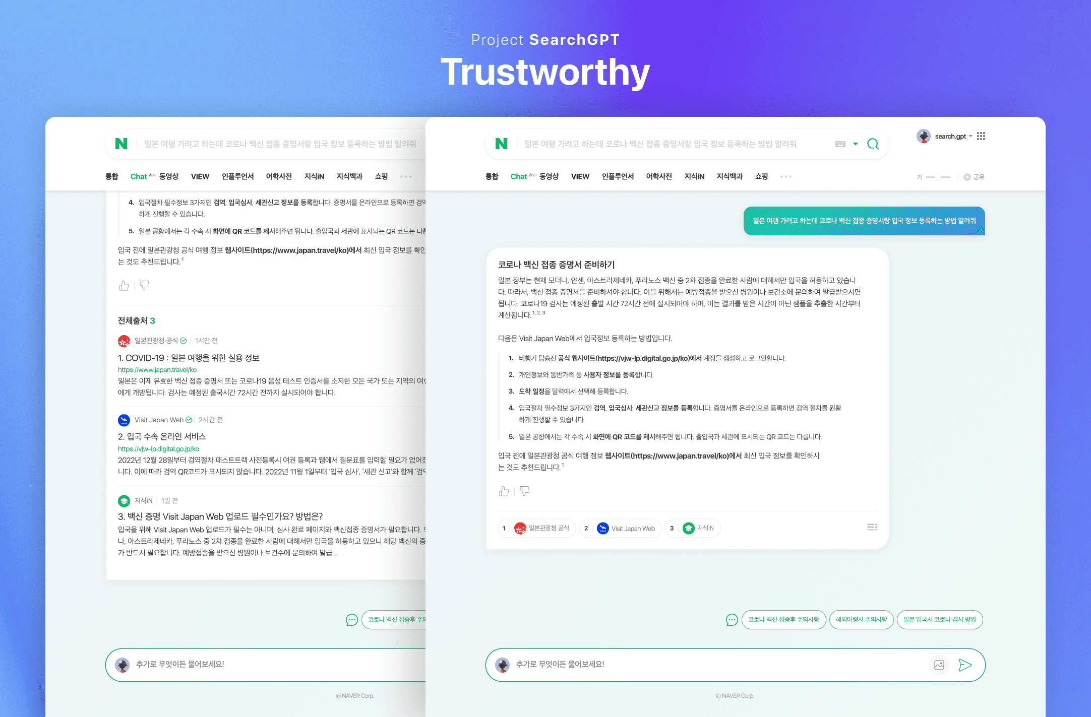 그는 “정보의 신뢰성(trustworthy), 네이버 서비스와의 연결성(connected), 효과적인 정보 제공을 위한 멀티모달(multimodal) 세 가지를 중점으로 프로젝트를 진행 중”이라고 말했다. 이어 “▲최신성과 정보 간 교차·반복 검증 및 사용자 피드백을 통해 정확성과 신뢰성을 갖춘 정보를 생성하고 ▲쇼핑, 페이, 지도 등과 같은 네이버 서비스와의 유기적인 연동을 통해 사용자의 검색 의도에 최적화된 정보를 ▲이미지, 동영상, 음성 등과 함께 활용해 직관적인 형태로 제공하고자 한다”며 “‘SearchGPT 프로젝트’를 통해 사용자들에게 한층 더 차별화된 검색 경험을 제공할 수 있을 것으로 기대한다”고 말하며 키노트를 마쳤다.