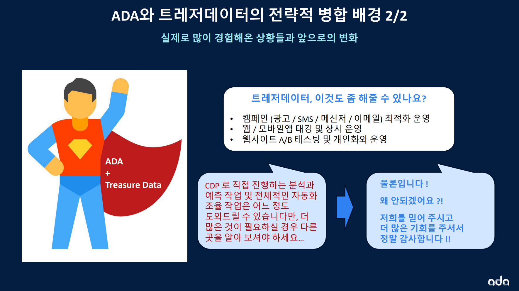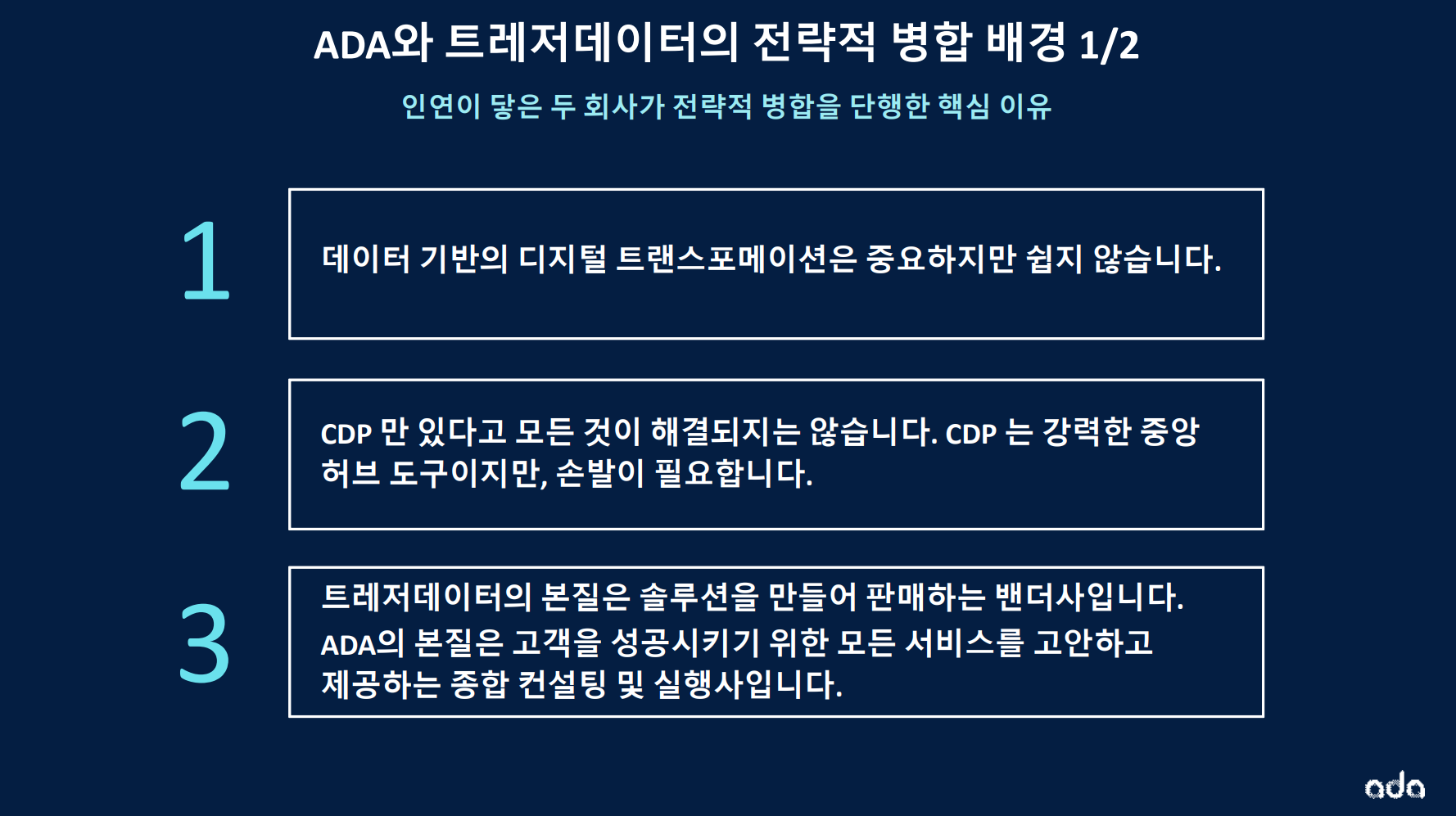 향후 두 회사는 ADA코리아란 명칭으로 사업을 진행할 예정이며, 대표이사에는 전 고영혁 트레저데이터코리아의 대표가 선임되었다. ADA코리아는 트레저데이터코리아의 모든 CDP 솔루션 영업권뿐만 아니라 엔지니어, 컨설팅 인력 등 전체 직원도 인수했다.