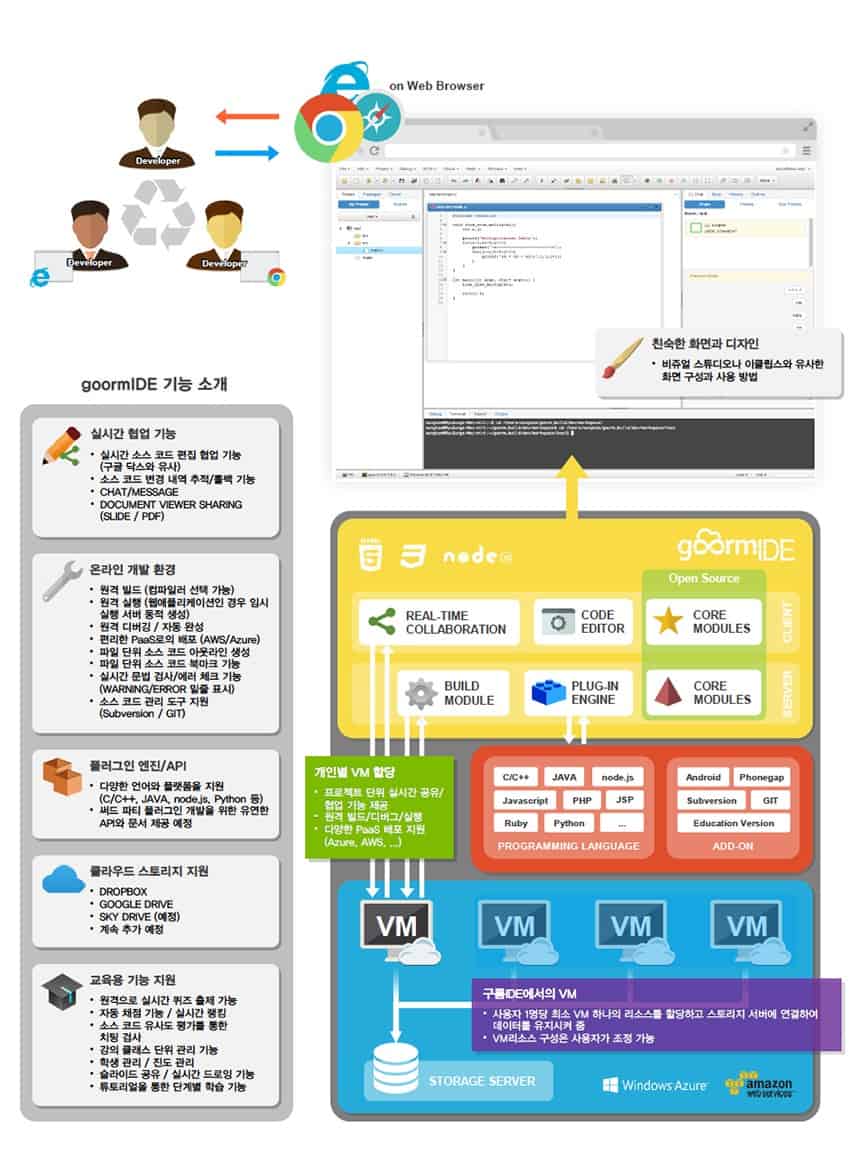 아시는 분들도 많겠지만 국내를 대표하는 클라우드 통합개발환경(IDE)인 구름IDE를 소개합니다. 클라우드 IDE 개념은 아주 간단합니다. 자신의 PC에 IDE를 설치하지 않고 웹 브라우저로 서비스에 접속해 온라인 상에서 C/C++, Java, PHP, JSP, Node.js, Python 등 원하는 언어를 가지고 빌드, 실행, 디버깅 할 수 있도록 하는 서비스입니다. 아래 인포그래픽을 보면 어떤 서비스 인지 바로 파악이 가능할 것입니다.