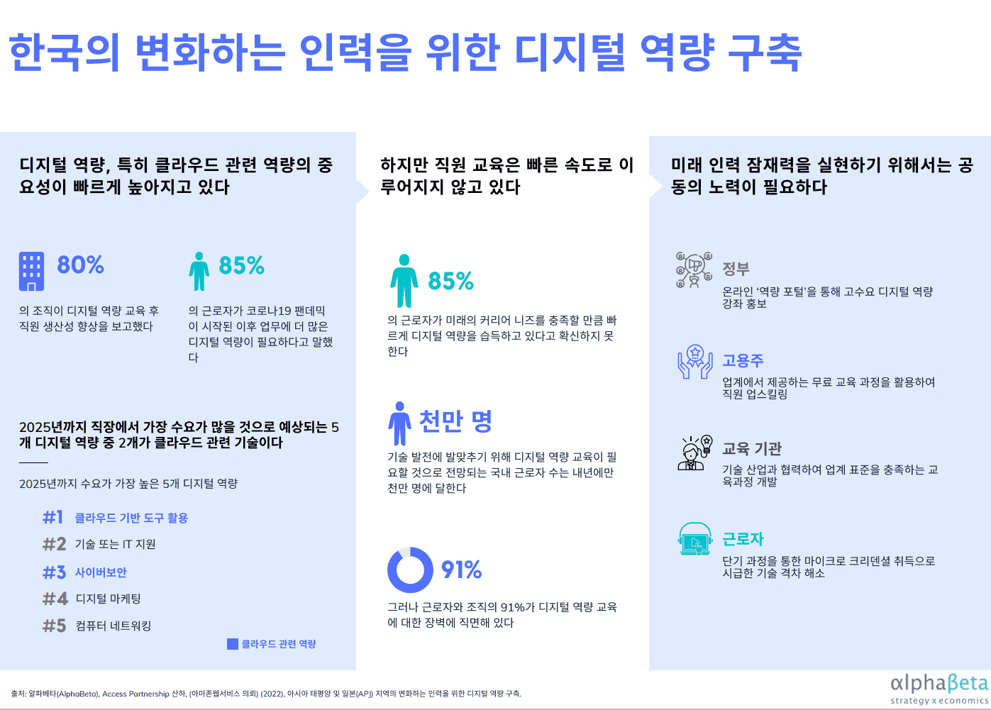 액세스 파트너십(Access Partnership) 산하의 전략 및 경제 컨설팅 기업인 알파베타(AlphaBeta)가 AWS의 의뢰로 조사한 ‘변화하는 인력을 위한 디지털 역량 구축’ 보고서는 국내 공공기관, 민간기업, 비영리기관의 기술직 및 비기술직 디지털 근로자 1,015명과 고용주 311명을 대상으로 설문조사를 진행했다.