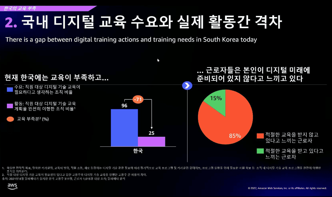 윤정원 AWS 코리아 공공부문 대표는 “팬데믹 기간 동안 많은 기업들이 디지털 전환 계획을 앞당겼고, 고용주와 근로자 사이에 클라우드 컴퓨팅, 사이버보안, ML과 같은 고급 역량에 대한 수요가 증가했다”고 밝히고, “이번 보고서는 근로자와 고용주들이 디지털 역량 지식을 늘리고 기술의 이점을 극대화하는 것이 시급함을 보여준다. AWS는 디지털 역량의 부족 문제를 해결하기 위해 업계, 정부기관 리더들과 협력하여 개인, 스타트업, 기관들에게 교육 기회를 제공하고, 에듀테크 기업들이 유초중고에 교육 지원을 할 수 있도록 지원하고 있다. IT 초급자부터 전문가에 이르기까지 새로운 클라우드 컴퓨팅 역량을 얻고자 하는 모든 이들에게 지원을 아끼지 않는 것이 우리의 목표”라고 덧붙였다.