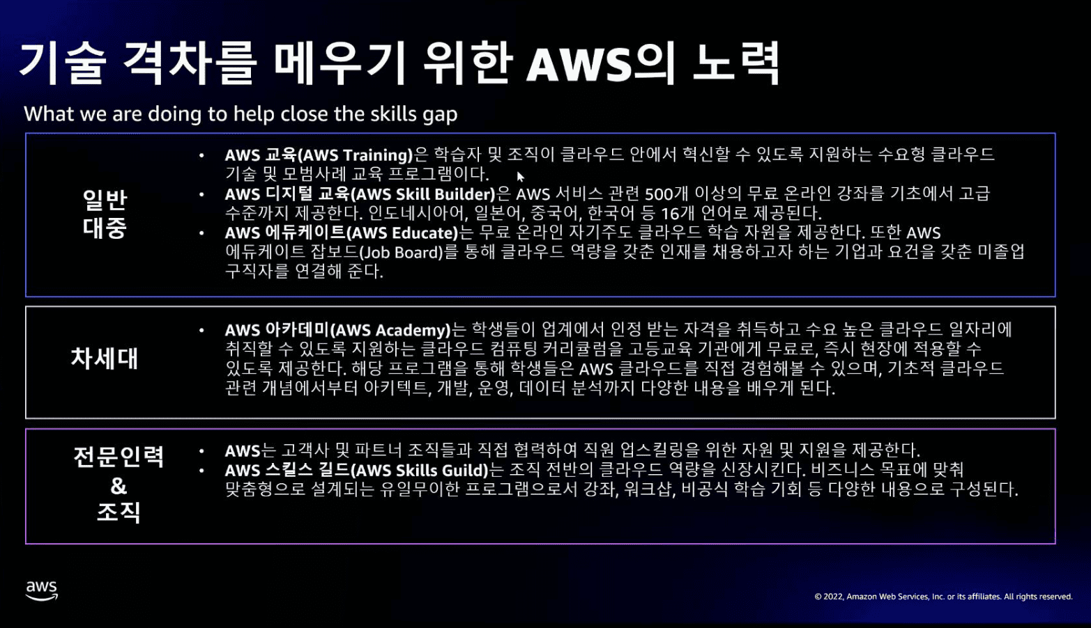 AWS는 이러한 도전 과제 해결을 위해 기술 장벽을 허물고자 2,900만 명에게 무료 클라우드 역량 교육을 제공하는 프로그램의 일환으로 전 세계적으로 수억 달러를 투자하고 있다. AWS는 배움에 대한 열망이 있다면 누구나, 인터넷 접속을 통해 수강할 수 있는 500개 이상의 무료 디지털 교육 강좌를 제공하고 있으며 그 중 250여 개는 한국어로도 제공되고 있다.