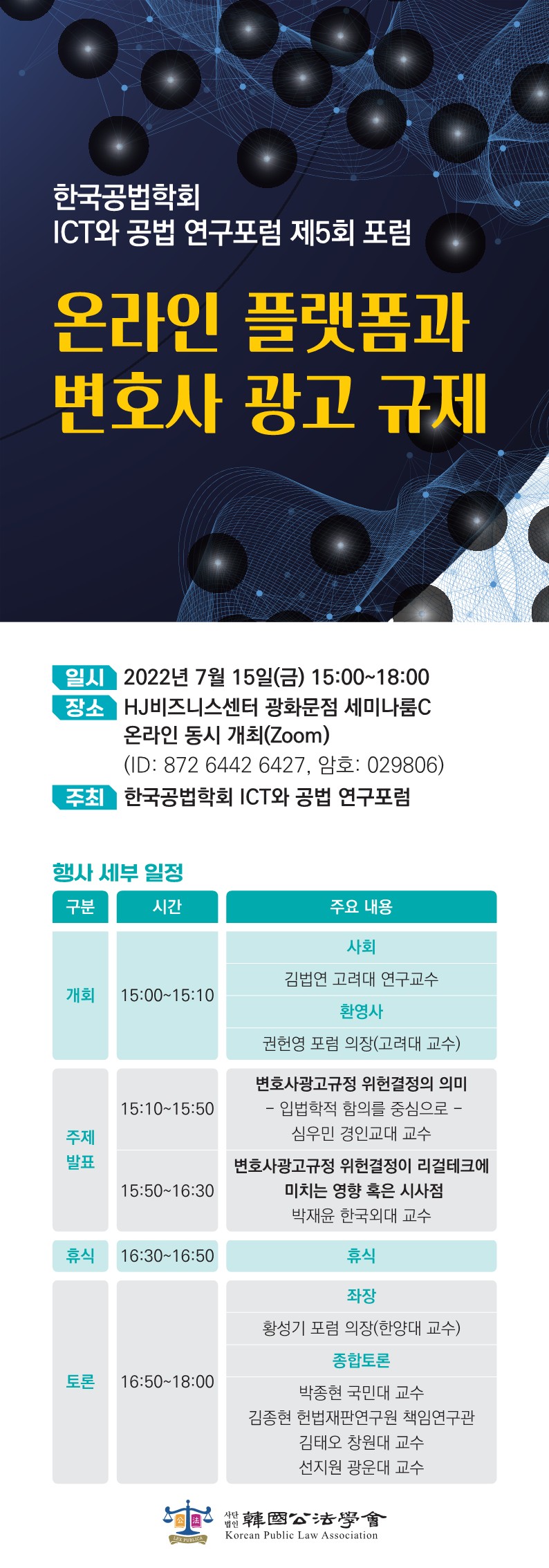 한국공법학회 소속 일반연구포럼인 ‘ICT와 공법 연구포럼’(의장 권헌영, 황성기)은 오는 15일 오후 3시부터 HJ비즈니스센터 광화문점 세미나룸C 및 온라인(ZOOM)에서 ‘온라인 플랫폼과 변호사 광고 규제’를 주제로 제5회 포럼을 개최한다고 밝혔다.