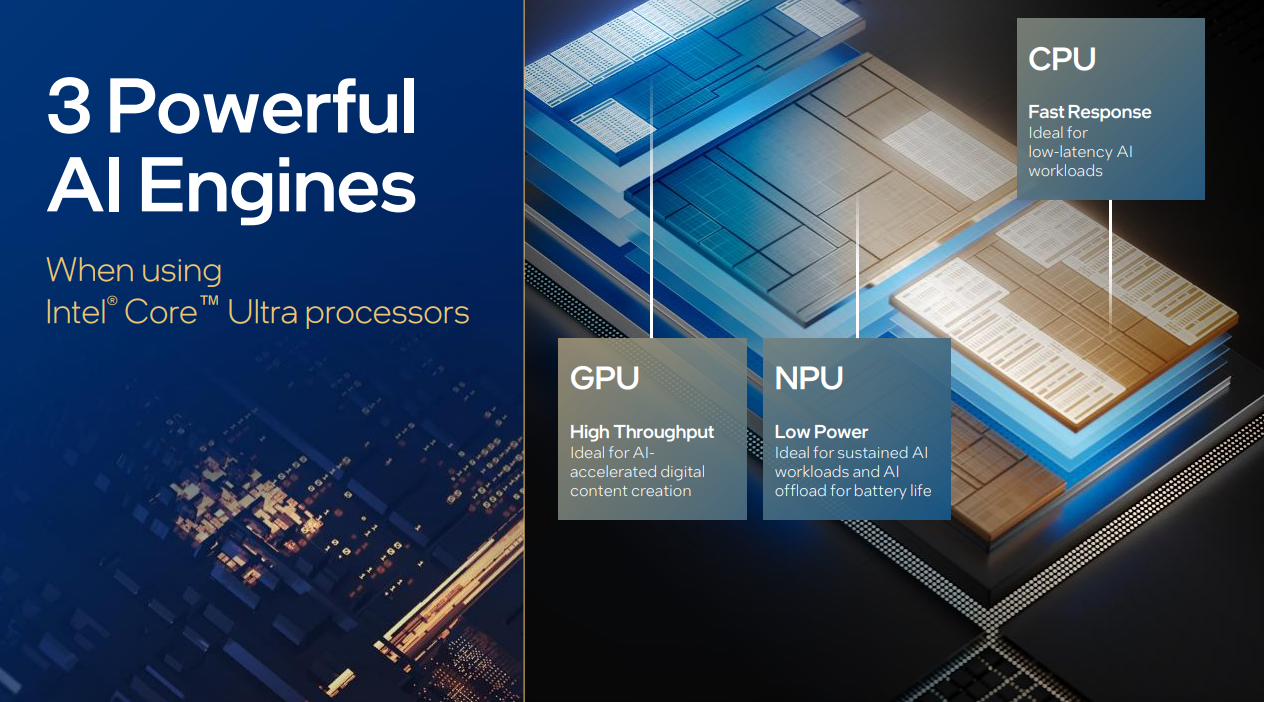 인텔 AI 부스트(Intel AI Boost)로 명명한 최신 인텔 NPU는 저전력으로 장시간 실행되는 AI 워크로드를 처리하도록 특별히 설계됐으며, CPU와 GPU 모두에서 처리되는 AI를 보완하고 이전 세대보다 2.5배 향상된 전력 효율성을 제공한다.