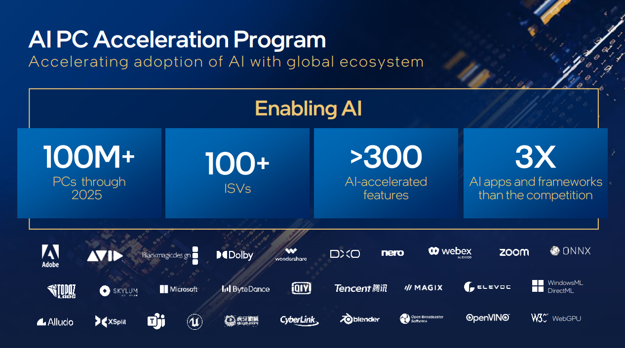 AI PC 경험은 지원하는 소프트웨어만큼 강력해진다. 인텔의 AI PC 가속 프로그램(AI PC Acceleration Program)의 일환으로 100개 이상의 독립 소프트웨어 공급업체(ISV: Independent Software Vendor)와 300개 이상의 AI 가속 기능이 인텔 코어 Ultra 프로세서에 맞춰 최적화된다. 이는 경쟁사보다 3배 더 많은 AI 앱 및 프레임워크이다 .