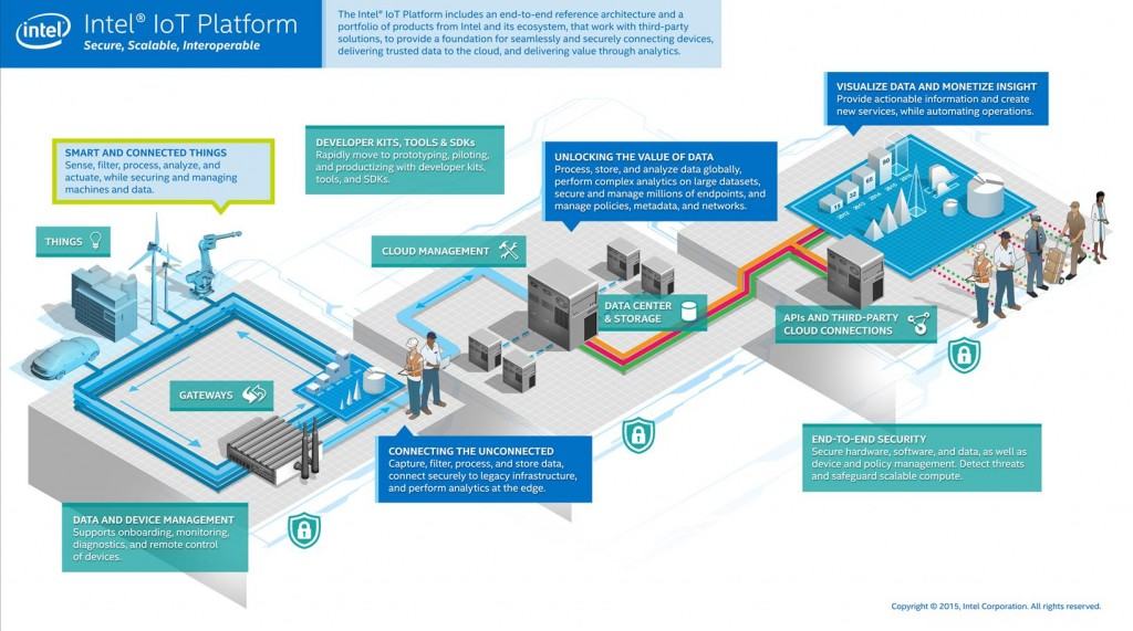 SANTA CLARA, Calif., Nov. 2, 2015 – Intel Corporation today announced a new Intel® IoT Platform reference architecture and new hardware and software products as part of its effort to build out one of the most comprehensive offerings for the Internet of Things (IoT) marketplace. The platform includes two reference architectures and a portfolio of products from Intel and its ecosystem to address the IoT opportunity. The products include new Intel® Quark™ processors for IoT, free and simple operating systems with a comprehensive cloud suite from Wind River, and analytics capabilities, all designed to build and secure smart and connected solutions from things to the cloud.