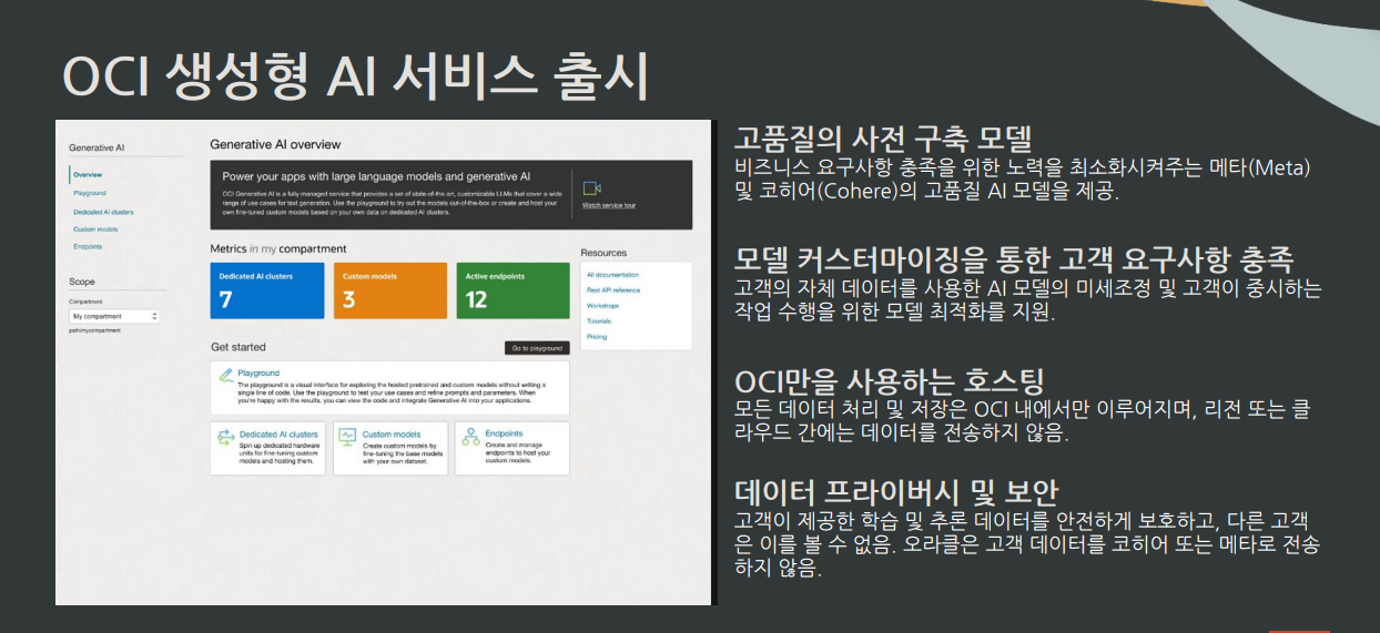최근 오라클은 '오라클 클라우드 인프라스터럭처 생성형 AI(OCI Generative AI) 서비스를 정식 출시했다. 이 서비스는 기업용 B2B 시장을 겨냥한 AI 기업으로 대표되는 코히어(Cohere)와 메타(Meta)의 라마2(Llama2) 거대 언어모델(LLM)을 원활하게 통합하는 완전 관리형 서비스다. 경쟁업체인 아마존의 베드록처럼 클라우드 사업자가 LLM 모델을 지정해 두고 고객은 이 환경 아래서 API를 통해 활용하는 방식과 동일하다.
