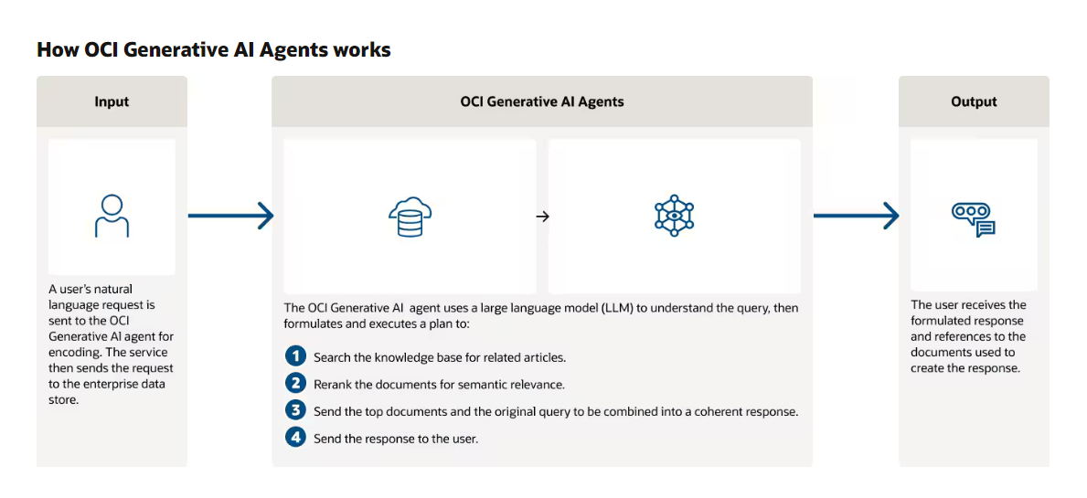 오라클은 생성형 AI 서비스 이외에 OCI 생성형 AI 에이전트 베타 버전도 선보였다. 에이전트는 사용자 쿼리를 생성형 AI 컴포넌트(검색 도구, 문서 코퍼스, LLM, 응답 생성 등)가 수행하는 작업으로 변환해 쿼리에 대한 답변을 제공한다. OCI 제너레이티브 AI 에이전트 시리즈의 첫 번째 에이전트는 검색 증강 생성(RAG) 에이전트로, OCI 오픈서치를 사용해 내부 데이터로 LLM에 대한 일반 지식을 보완해 문맥에 맞는 답변을 제공한다. 사용자는 전문 기술이나 데이터의 형식이나 저장 위치를 몰라도 자연어를 통해 다양한 엔터프라이즈 데이터 세트에 투명하게 액세스할 수 있다.