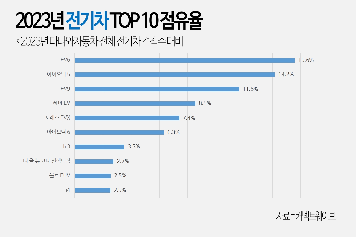 다나와자동차 통계에 따르면 2023년 가장 많은 견적이 등록된 전기차는 ‘EV6’로 전체 중 15.6%를 차지했다. 이어서 아이오닉5(14.2%), EV9(11.6%), 레이EV(8.5%), 토레스EVX(7.4%)가 뒤를 따랐다.