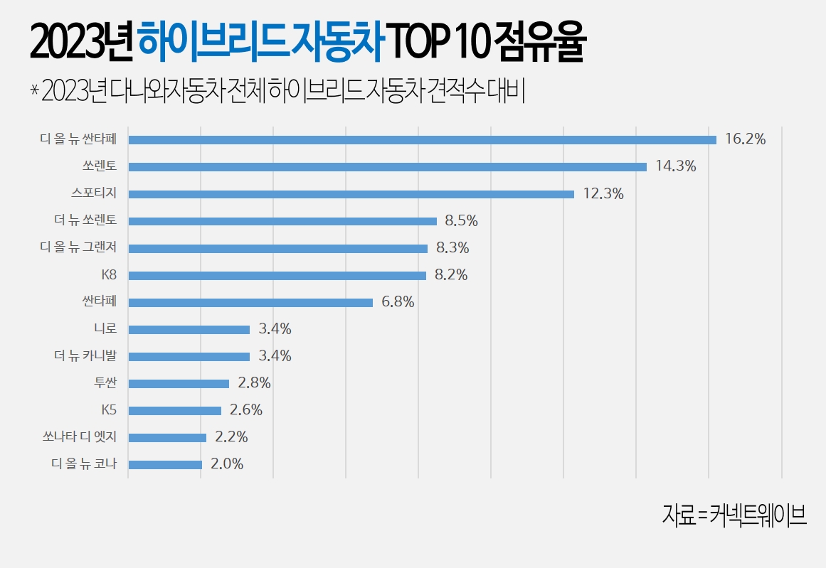 이와 함께 다나와자동차는 전기차와 함께 하이브리드 차량의 지역별 신차견적 통계도 공개했다. 경기도 수원시(3.6%), 화성시(3.6%) 충북 청주시(2.9%)에서 가장 많은 견적이 등록됐으며, 차량 별로는 디올뉴싼타페(16.2%), 쏘렌토(14.3%), 스포티지(12.3%) 견적이 많았다.