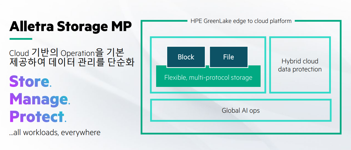 이를 통해 고객은 워크로드 및 스토리지 프로토콜에 관계없이 스토리지 서비스를 배포, 관리 및 오케스트레이션할 수 있게 되었다. HPE 알레트라 스토리지 MP는 매우 유연하여 합리적인 비용에 더 좋은 성능을 누릴 수 있고 향후 동일한 하드웨어에서 인프라스트럭처를 더 비용효율적으로 확장할 수 있어 동시에 투자비용 보호 효과도 더욱 향상되었다. 뿐만 아니라, AI옵스(AIOps) 기반 직관적인 클라우드 경험으로 특별한 기술 없이도 스토리지를 프로비전하고 관리할 수 있다.