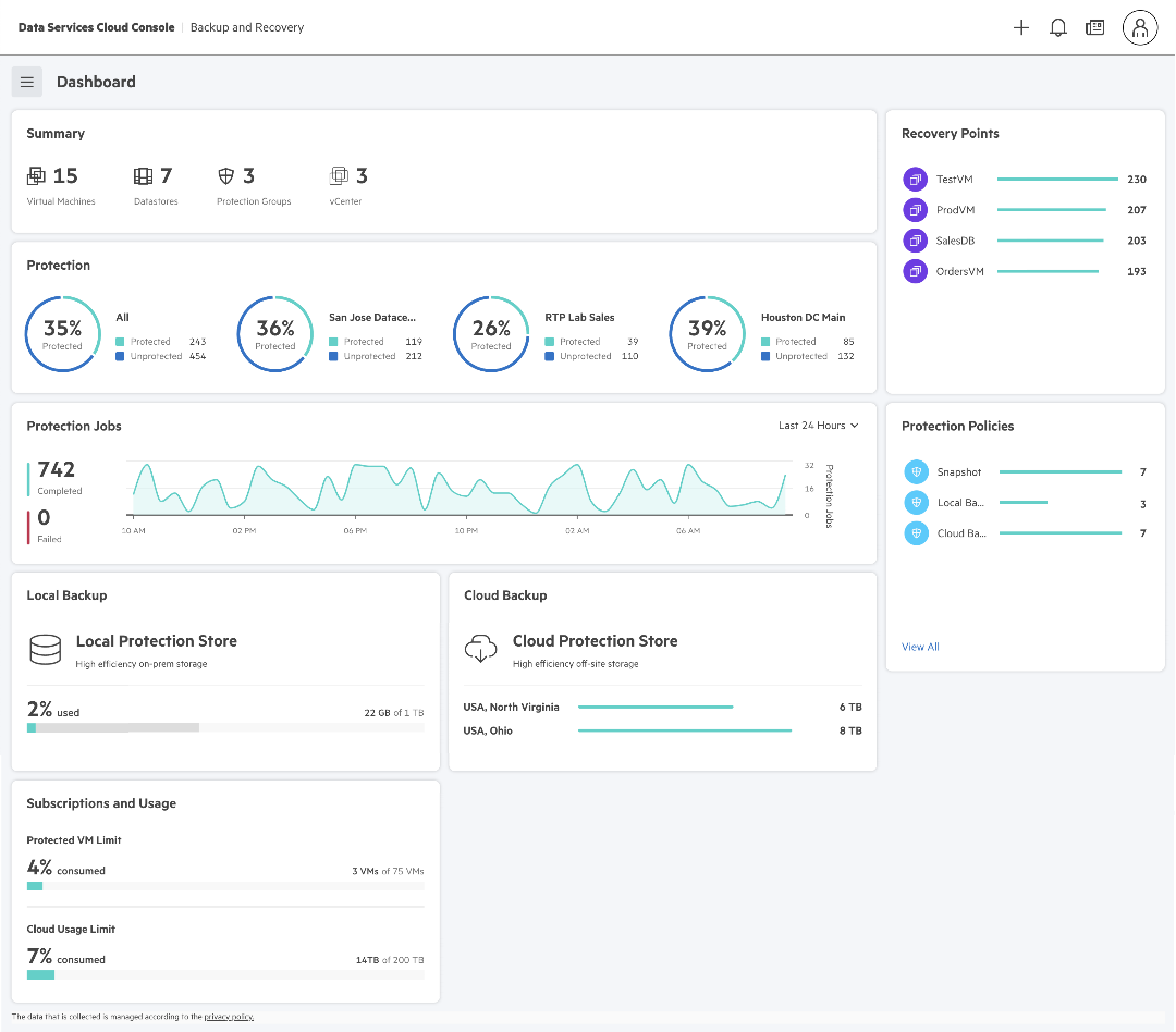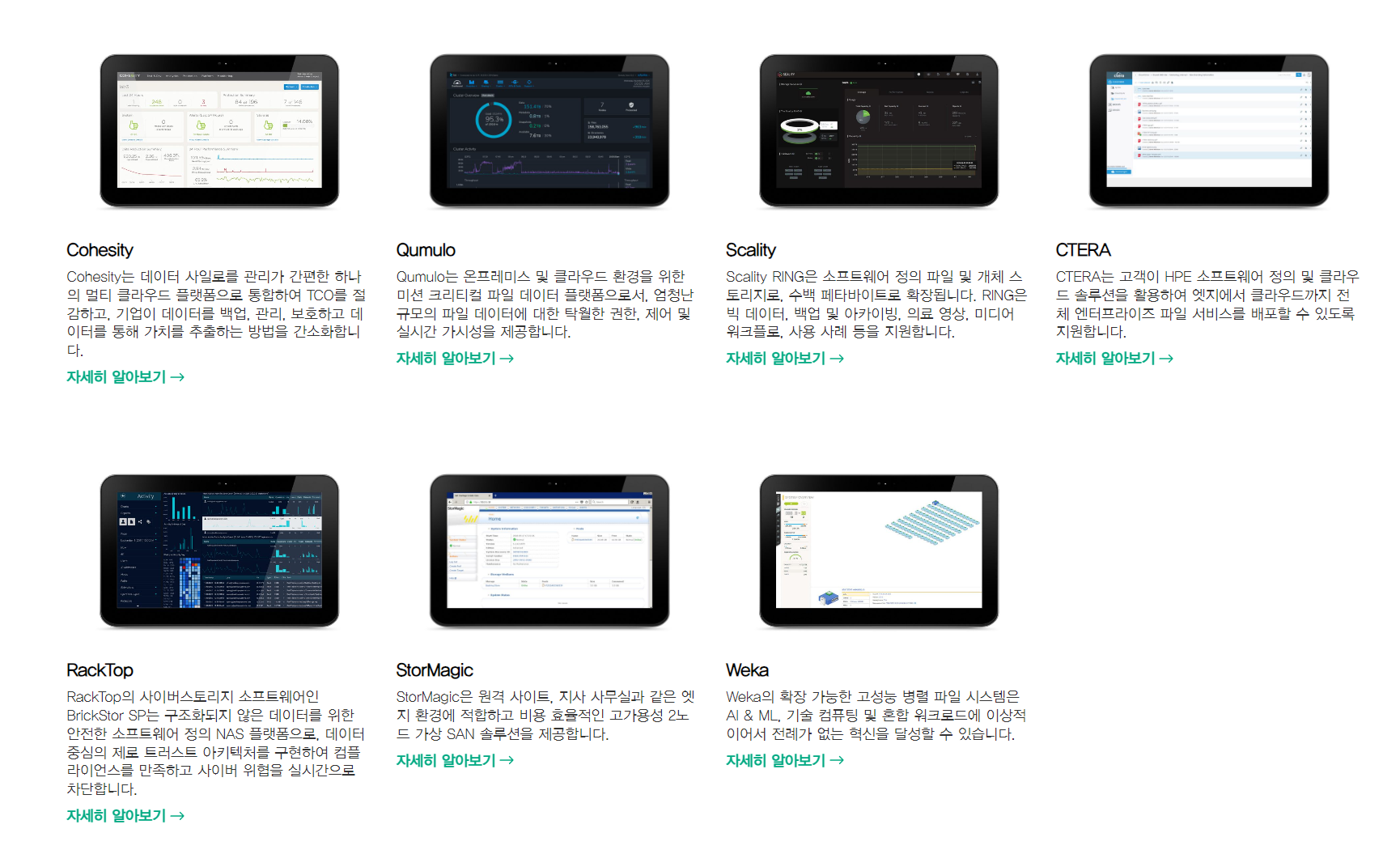 - 재해복구용 HPE 그린레이크(HPE GreenLake for Disaster Recovery): HPE의 글로벌 단위로 확장가능한 SaaS 플랫폼을 통해 지속적으로 데이터를 보호함으로써 데이터 손실 및 다운타임을 최소화하면서 유연한 비용 지불 방식을 제공한다. 젤토(Zerto) 기술을 기반으로 재해복구용 HPE그린레이크는 여러 가상머신 전반에 걸쳐 하나로 통일되고 자동화 및 오케스트레이션된 경험을 제공함으로써 어떤 장애에도 빠르고 유연하게 복구할 수 있다.