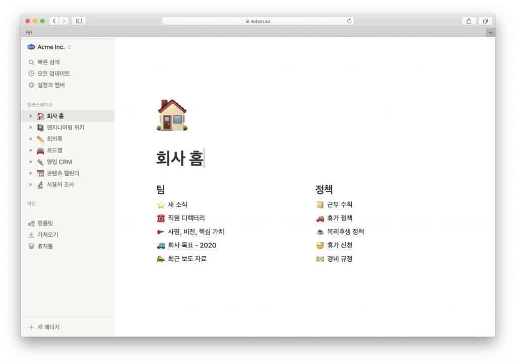 노션은 필수 업무 도구를 하나의 작업 공간에 통합한 올인원(all-in-one) 생산성 앱이다. 개인 사용자는 물론 팀과 회사 차원에서도 노션으로 다양한 워크플로우 생성할 수 있다. 독서 리스트 작성, 일기쓰기 같은 개인의 단순한 작업부터 회사 정보 관리를 위한 위키 페이지, 제품 개발 로드맵, 채용 공고, 구직자 확인 시스템, 업무용 캘린더, 고객관계관리(CRM)에 이르기까지 팀과 회사의 다양한 업무도 노션으로 가능하다.