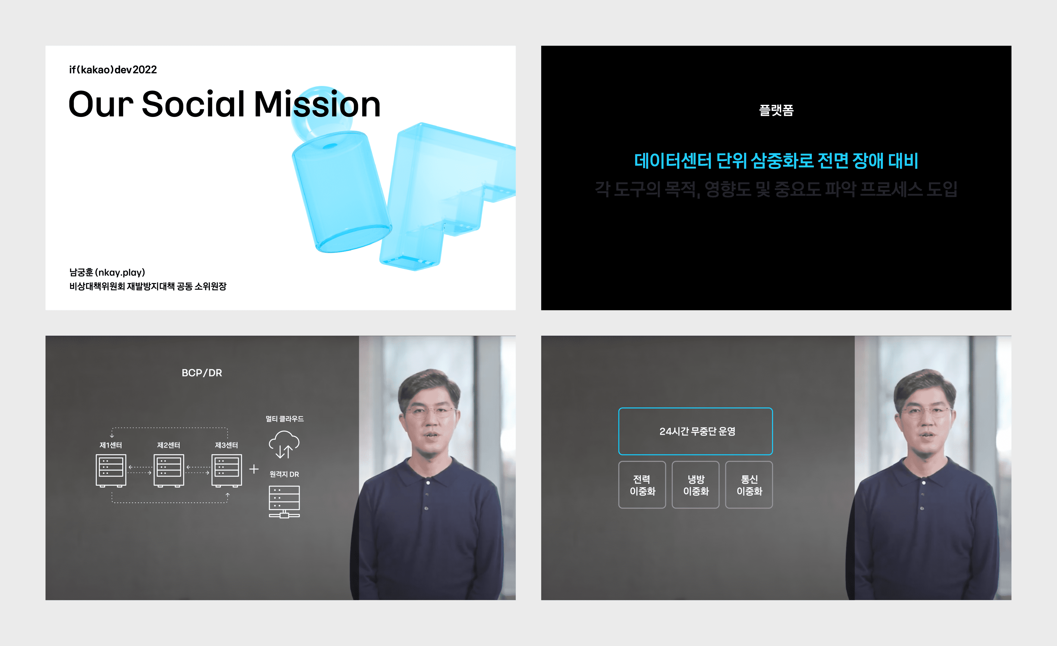 남궁훈 재발방지대책 공동 소위원장은 ‘Our Social Mission’ 키노트에서 카카오의 사회적 소명과 유사 사고 재발 방지를 위한 각오를 피력했다. 카카오 ESG 최우선 과제를 ‘서비스를 안정적으로 제공하는 것’으로 설정하고 인프라 개선을 위해 과거 원인 분석, 현재 재발방지책, 미래 투자 크게 3가지 관점에서 실천과제를 세우겠다고 밝혔다. 고우찬 재발방지 공동 소위원장을 필두로 인프라 조직을 대폭 강화하고 안정적인 서비스 환경을 조성하겠다고 전했다.