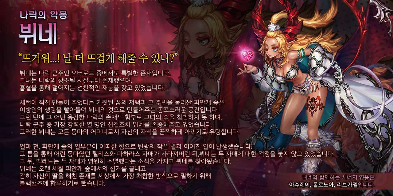 이번 업데이트에서는 신규 세컨드임팩트 영웅을 선보이고 다양한 이벤트들도 마련한다. 새롭게 등장하는 세컨드임팩트 ‘뷔네’는 자신의 딸들을 해친 존재를 처치하려는 목표를 가진 캐릭터다. 딜러 포지션으로 일반 공격 시, 적 1인을 공격하고 일반 공격 피해를 증가시킨다. 아슈레이, 롤로노아, 리브가엘과 시너지를 이루며 길드 모험 콘텐츠에서 강력한 능력을 발휘한다.