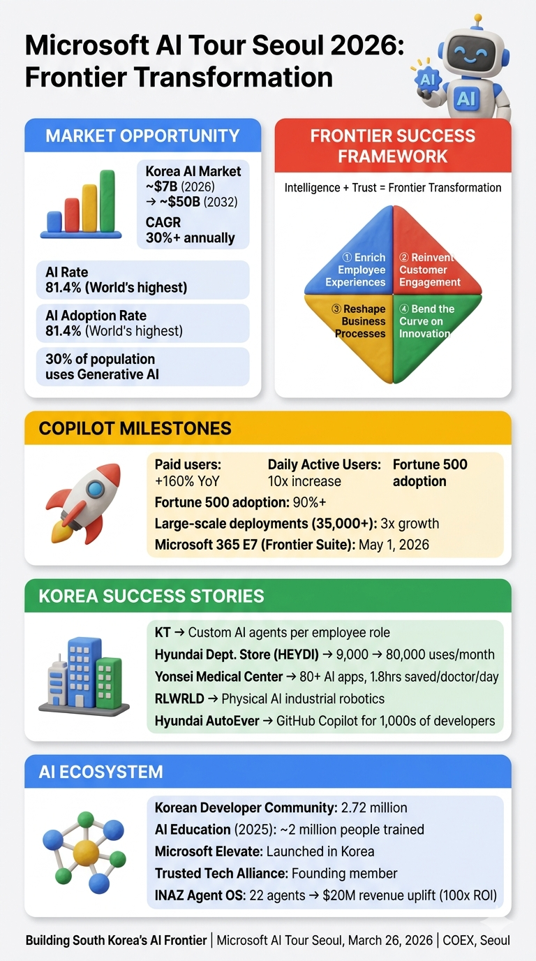 마이크로소프트 AI 투어 서울 2026이 던진 가장 큰 메시지는 단순하다. AI를 '도입할 것인가'의 시대는 이미 지났다. 이제 경쟁은 'AI로 무엇을 얼마나 빠르게 실현하느냐'를 놓고 벌어지고 있다.