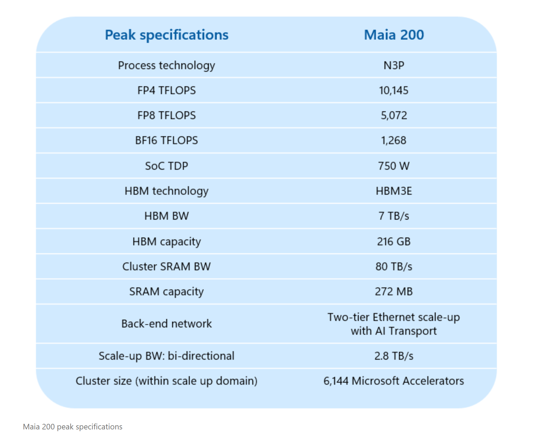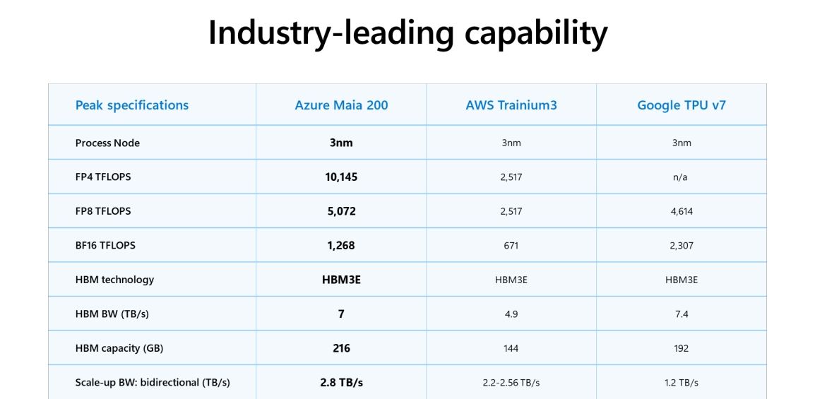 마이아 200은 TSMC의 3나노미터(nm) 공정을 기반으로 고성능 AI 추론에 최적화된 구조를 갖췄다. 특히 초당 7TB 대역폭의 216GB HBM3e 메모리 시스템과 네이티브 FP8/FP4 텐서 코어, 그리고 데이터 이동 엔진을 유기적으로 결합해 거대 모델에 최적화된 추론 성능을 제공하는 것이 특징이다.