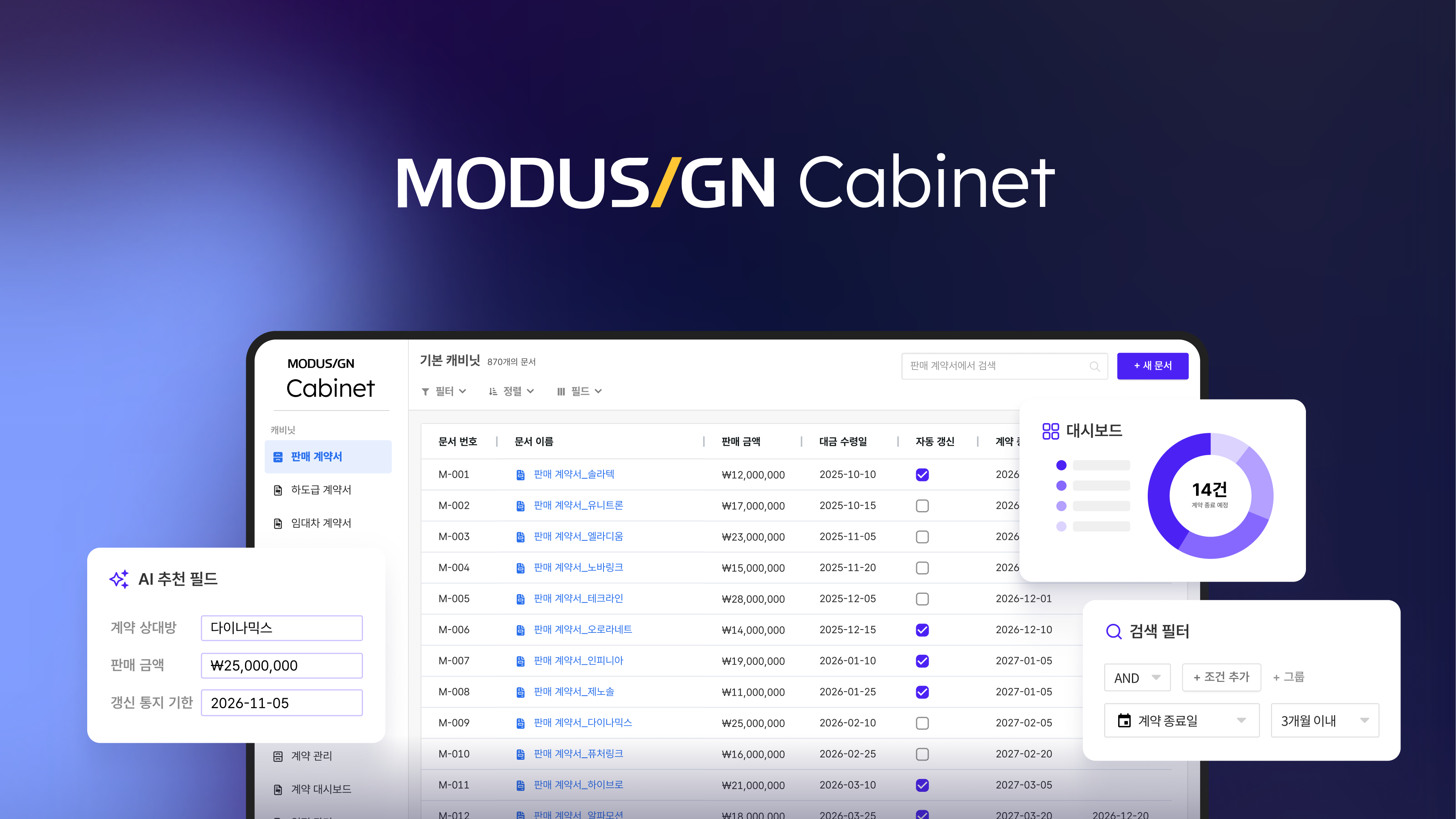 이번 간담회의 핵심은 신제품 ‘모두싸인 캐비닛(Cabinet)’이었다. 단순 문서함이 아니라, 계약서를 분석하고 위험을 찾아내며 일정과 의무 이행을 관리하는 ‘지능형 계약운영 플랫폼’이라는 점을 회사는 거듭 강조했다.