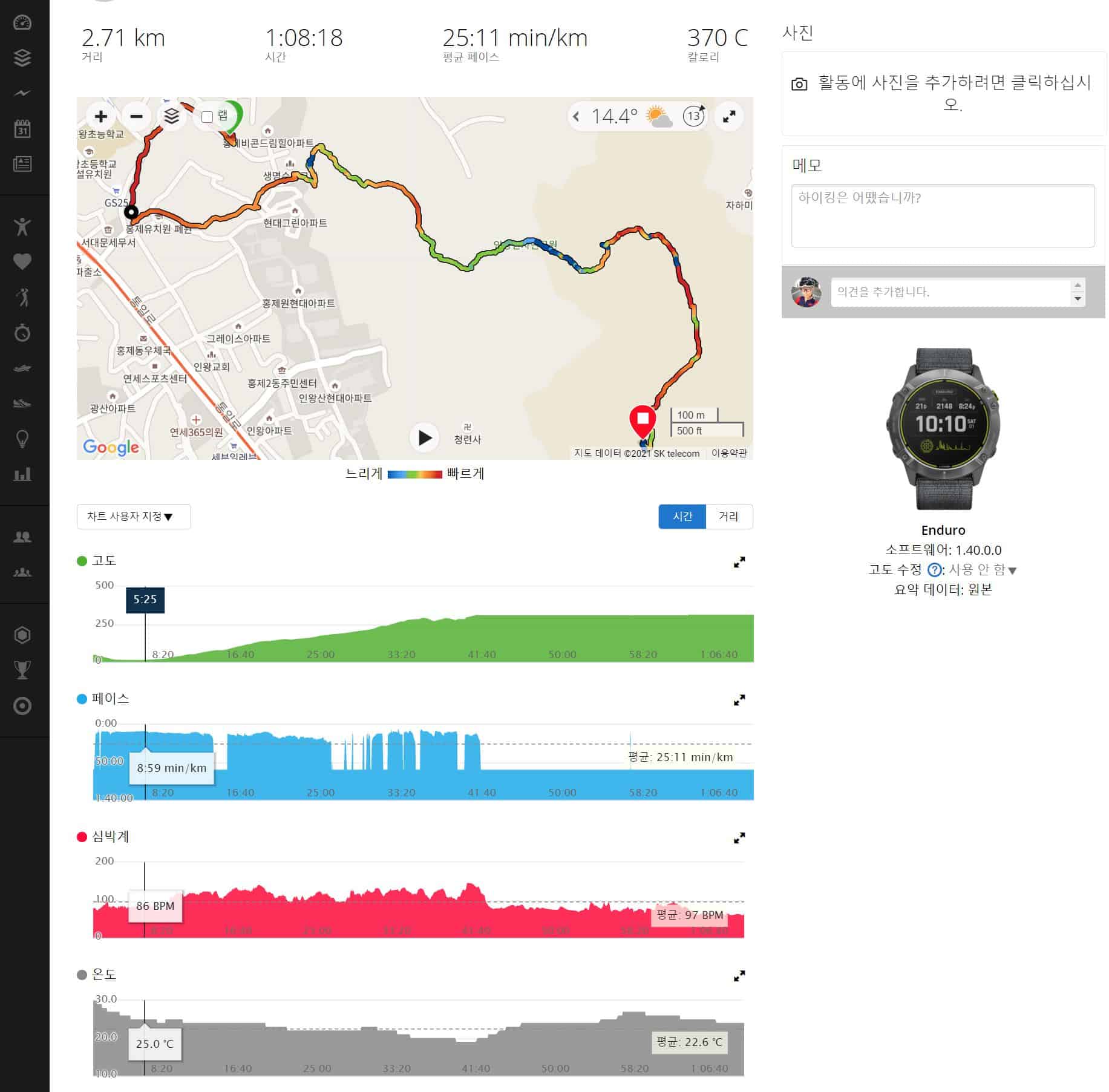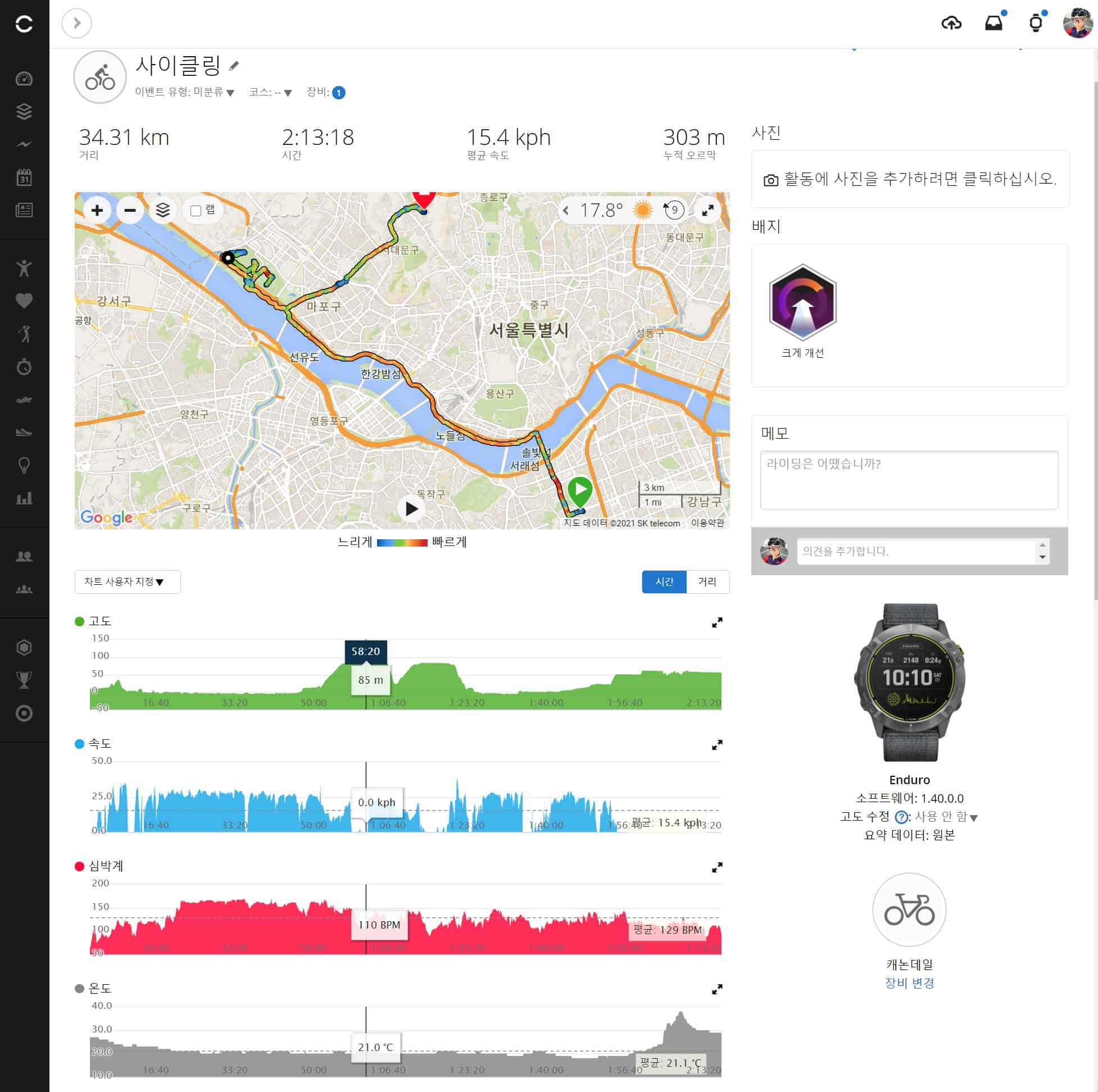 기존 애플워치, 갤럭시워치3등을 이용하고 있지만 거리 25Km 속도에 따라 다르지만 GPS사용시 배터리는 20%이상 소모된다. 엔듀로 태양광 충전 성능이 생각보다 우수해 가민 속도계 '엣지'에도 태양광 충전이 가능했으면 한다^^;