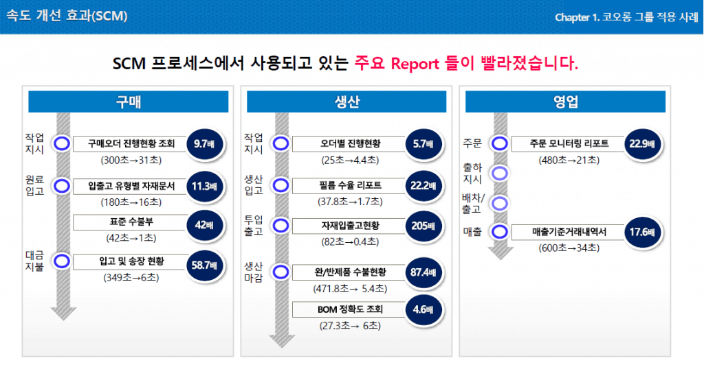 이를 통해 구매, 생산, 영업 등 각 부문에서 주요 리포트들이 빨라졌다. 특히 구매의 경우 입고와 송장 현황은 무려 58.7배 빨라졌고, 생산 분야 자재입고현황도 82초 걸리던 것이 0.4초 밖에 걸리지 않았다. 영업의 매출 기준 거래 내역서 관련해 17.6빼 빨라졌다. 재무 관리와 관리 회계 분야의 업무 효율도 높아졌다.