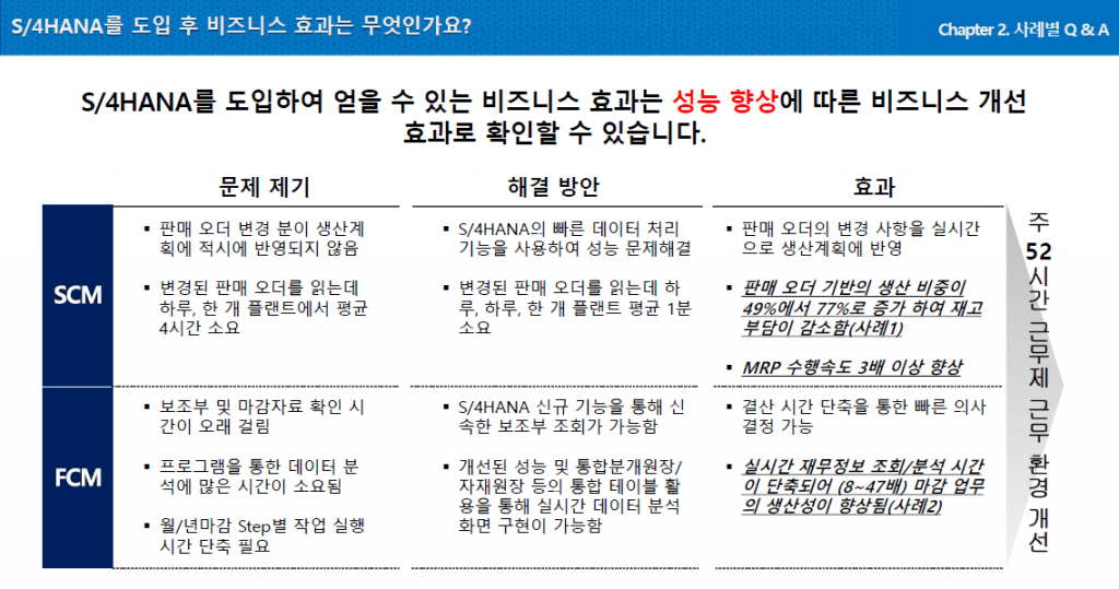 실제 도입 후 비즈니스 효과부문에서도 사전에 점검했던 내용들과 별반 다르지 않았다. 판매 오더 기반의 생산 비중이 49%에서 77%로 증가해 재고 부담이 감소했다. 재무 회계 파트에서도 실시간 재무정보 조회와 분석 시간이 8배에서 47배 가량 단축되어 마감 업무의 생산성도 향상되었다.