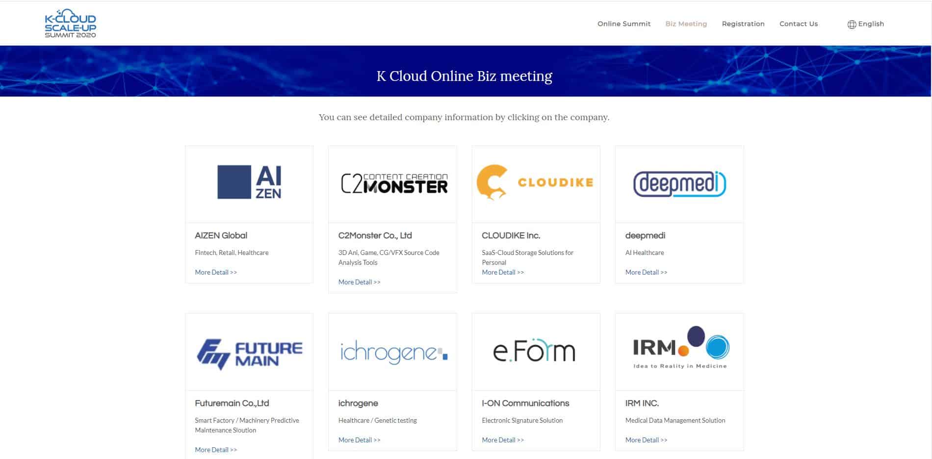 ‘2020 K-Cloud Scale up 온라인 서밋 & 상담회’ 운영을 위한 온라인 플랫폼이 구축되어 있으며, 플랫폼 내 행사소개 · 온라인 서밋 · 온라인 전시관 · 온라인 상담으로 이루어져 있다. 온라인 플랫폼은 행사기간 이 후에도 연중 운영되어 온라인 전시관에 게재된 기업별 피칭영상과 디렉토리를 통해 참여기업의 지속적인 홍보가 될 예정이다.