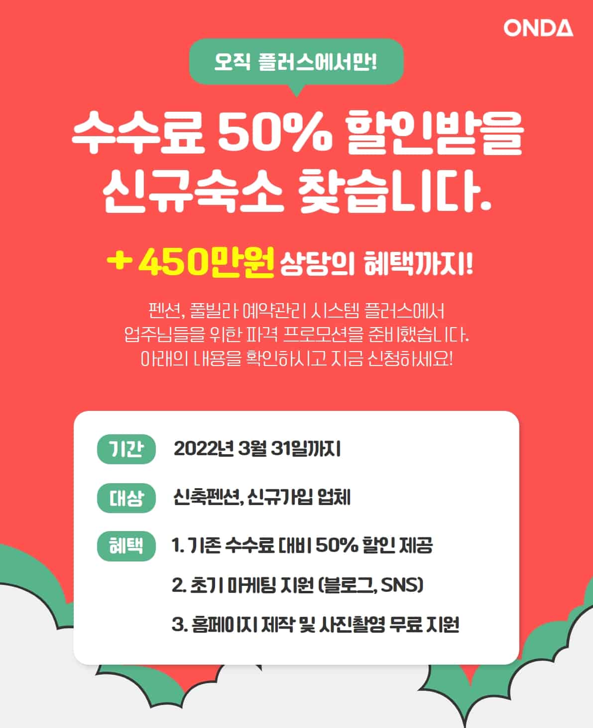 이번 행사는 코로나19 장기화로 침체되어 있는 숙박 업계에 활기를 불러일으키고, 새롭게 사업을 시작하는 신규 숙소 업주들의 안정적이고 성공적인 운영을 돕고자 기획됐다. 프로모션은 오는 3월 31일까지 열리며, 해당 기간 동안 온다의 ‘플러스’ 서비스 신규 가입 업체를 대상으로 진행된다.
