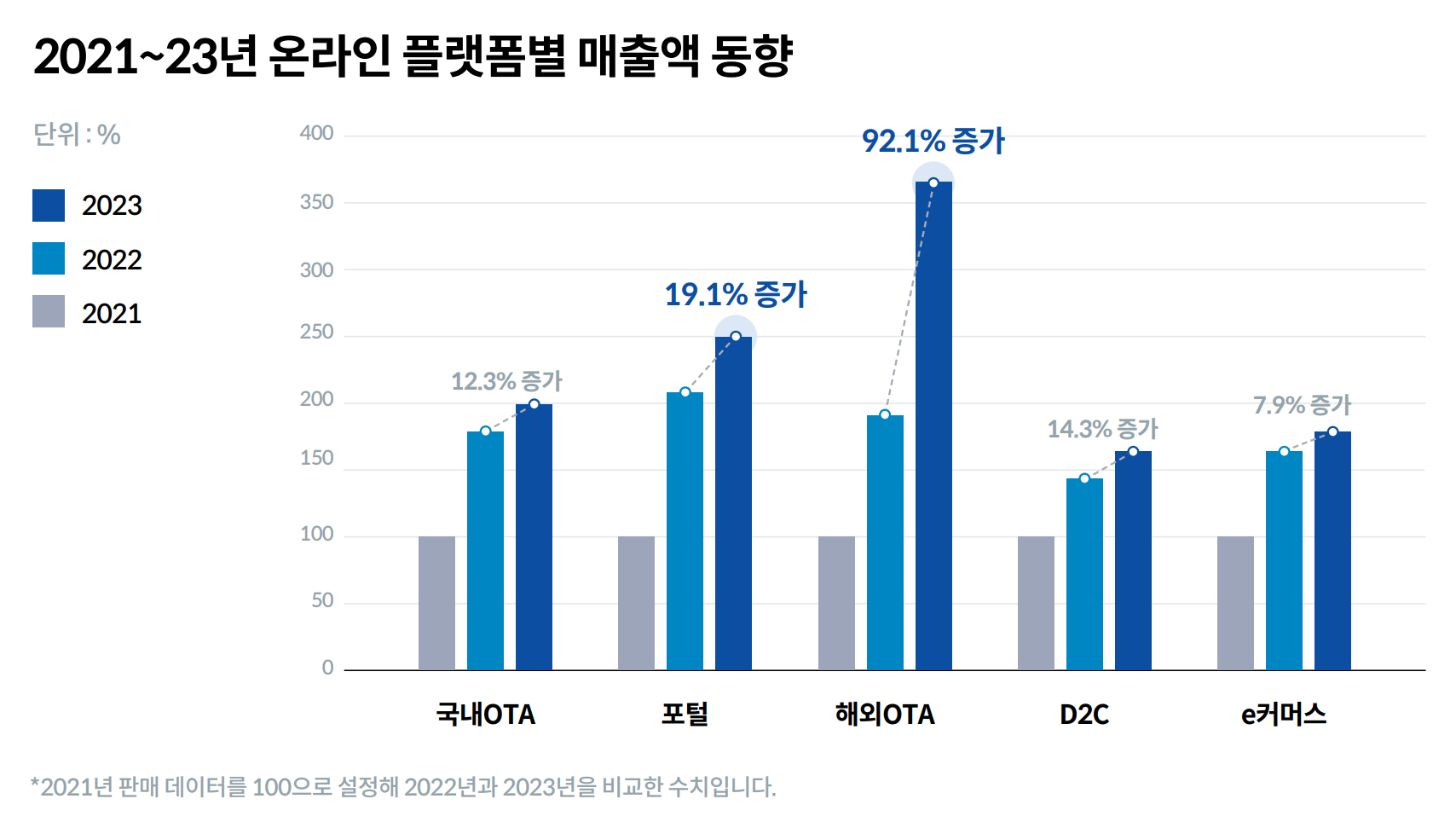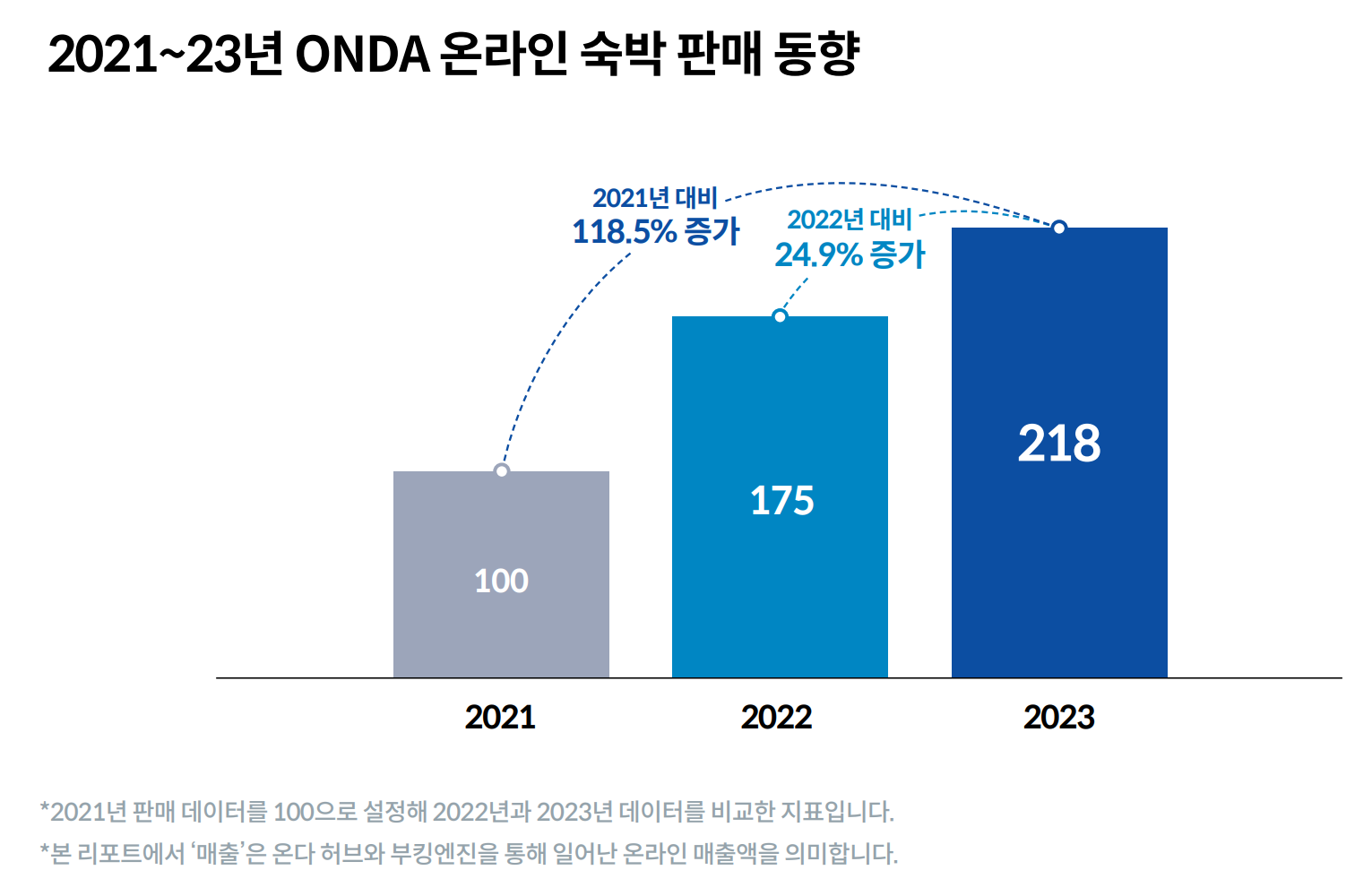 29일 호스피탈리티 테크 기업 온다(ONDA)가 발표한 ‘2023~24 호스피탈리티 데이터 & 트렌드 리포트’에 따르면 지난해 ONDA를 통한 온라인 숙박 판매액은 전년 대비 24.9%, 2021년 대비 두배 이상(118.5%) 증가했다.