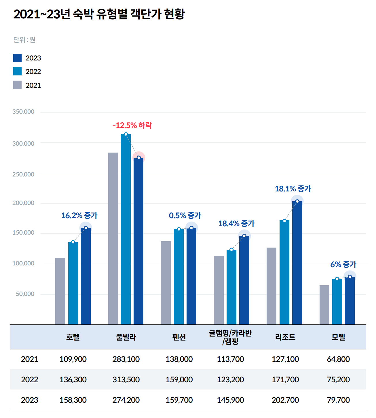 숙박 형태별로도 코로나 시기 집중됐던 독립형 숙소들의 인기는 주춤한 반면 호텔·리조트 등 다수가 묵는 숙박 시설의 인기가 높아졌다. 가장 대표적으로 호텔의 객단가는 지난해보다 16% 증가한 15만8000원을 기록했지만, 풀빌라는 2023년 31만4000원에서 12.5% 떨어진 27만4000원으로 집계됐다.