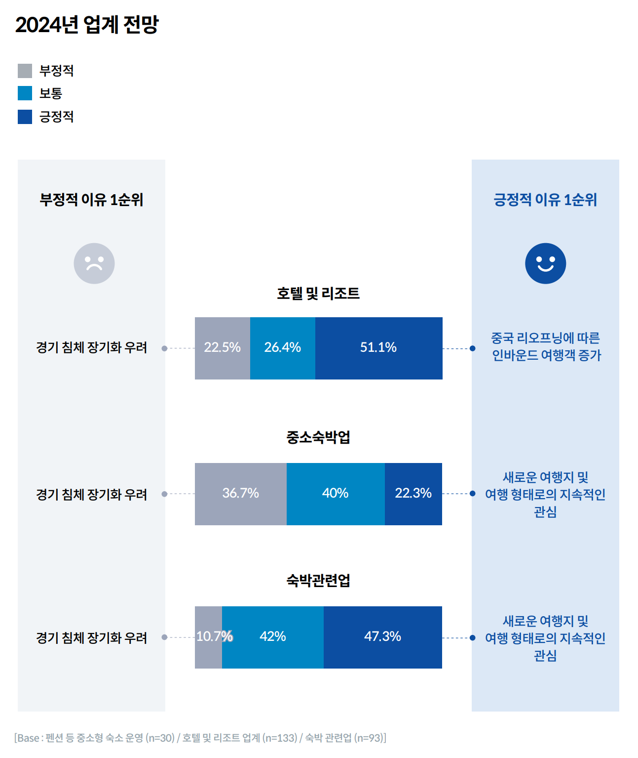 2024년 전망도 엇갈린다. 호텔 및 리조트 종사자의 51%가 2024년 전망을 긍정적으로 봤지만, 중소 숙박업주의 긍정적 전망은 22%에 불과했다. 긍정적인 이유로는 ▲중국 여행자 증가 ▲새로운 여행지 및 여행 형태로의 지속적인 관심을 꼽았다. 부정적 이유로는 ‘경기 침체 장기화’에 따른 걱정이 가장 많았다.