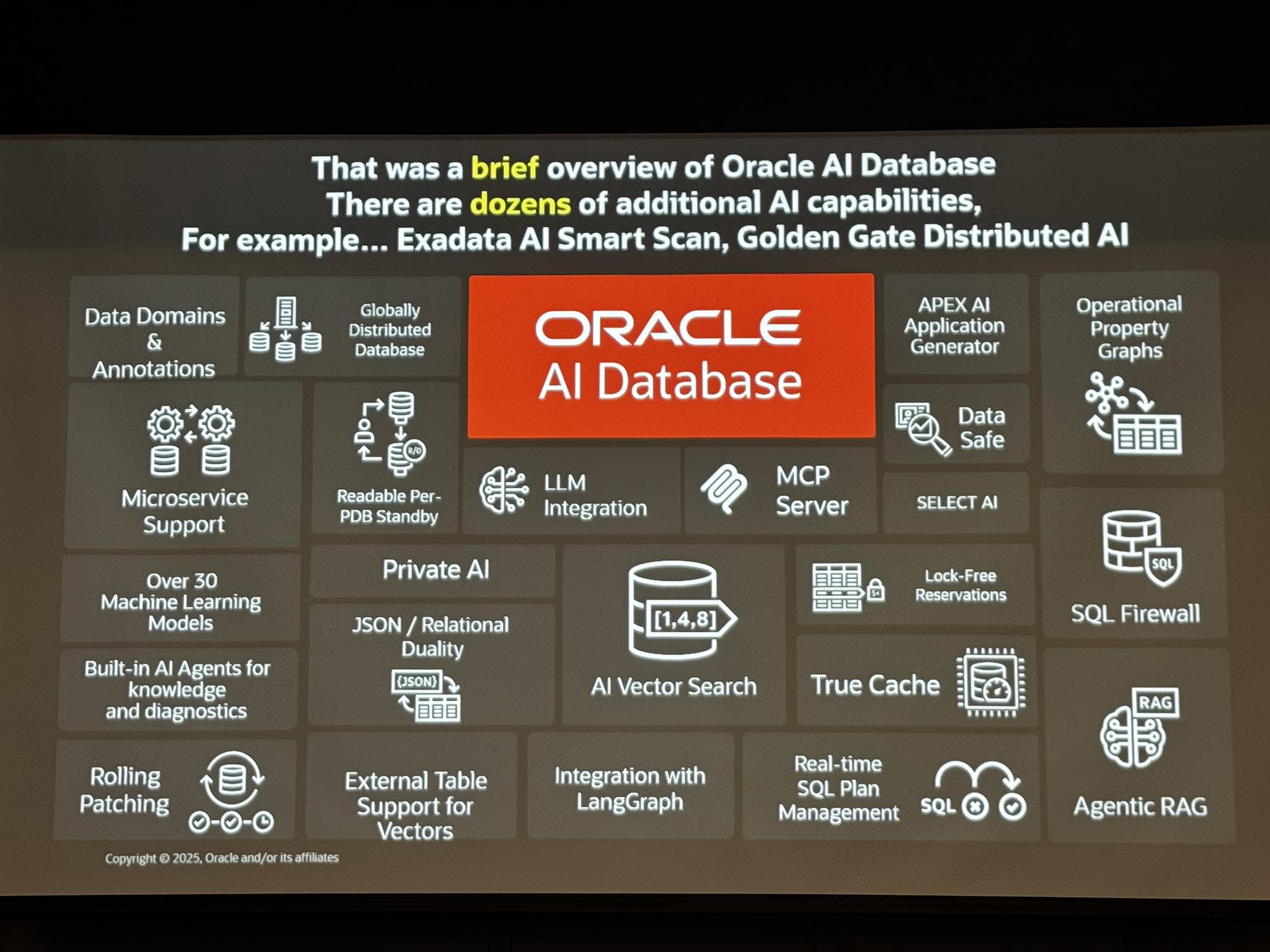 26ai의 주요 기능으로는 △데이터베이스 내 ONNX 벡터 생성 △HNSW 및 IVF 플랫 벡터 인덱스 △JSON/OSON 벡터 지원 △Exadata AI 스마트 스캔 △하이브리드 벡터 인덱스 △LangChain, LlamaIndex, LangGraph 통합 △Private AI Agent Factory 등이 있다.
