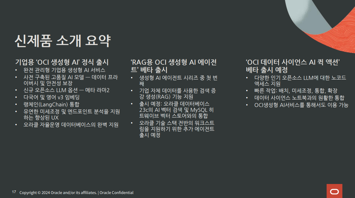 오라클의 그렉 파블릭(Greg Pavlik) 오라클 클라우드 인프라스트럭처(OCI) 사업부문 AI 및 데이터 관리담당 수석부사장은 "오라클의 AI 부문 전략적 목표는 기업들의 광범위한 AI 도입을 위해 실제 비즈니스 사례에서 발생했던 문제들을 해결하는 데 집중하는 것이다. 따라서 빠르고 비용 효율적인 AI 인프라를 기반으로 생성형 AI 모델을 자체 애플리케이션 및 융합형 데이터베이스에 통합하고, 새로운 LLM 및 관리형 서비스 제공을 통해 AI를 오라클 기술 스택의 모든 계층에 내장하고 있다"며, "오라클은 고객이 직접 모아서 구성해야 하는 방식의 도구모음이 아닌, 하나의 제품처럼 유기적으로 작동하는 강력한 사전구축 생성형 AI 서비스 및 기능 제품군을 제공한다. 이를 통해 고객은 비즈니스 문제를 영민하고 빠른 방식으로 해결할 수 있게 된다"고 말했다.