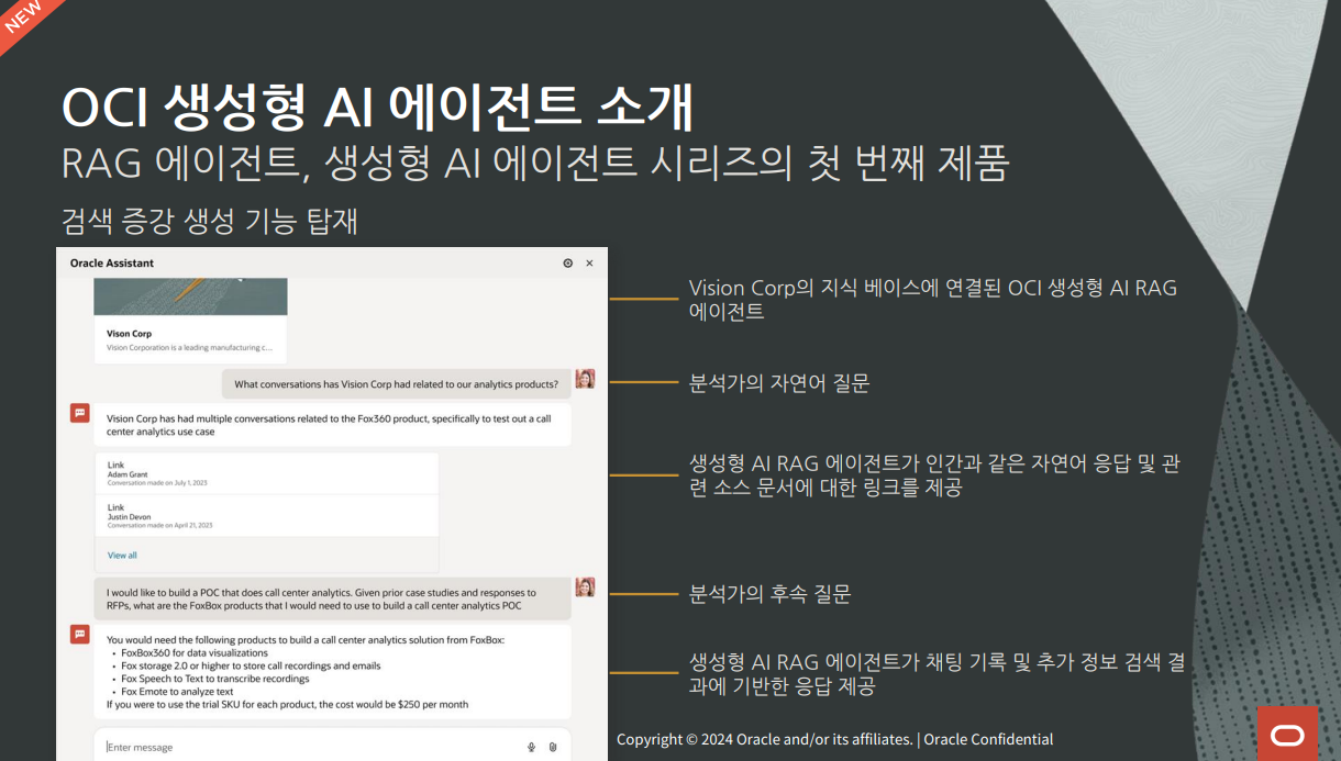 또한 오라클의 검색 증강 생성(Retrieval Augmented Generation, RAG) 기술을 통해 고객은 자체 데이터를 사용해 생성형 AI모델을 추가적으로 학습시킴으로써 조직의 독특한 내부 운영방식을 이해하도록 할 수 있다. 현재 베타 단계인 OCI 생성형 AI 에이전트(OCI Generative AI Agents) 서비스에는 RAG 에이전트가 포함돼 있다. OCI 생성형 AI 에이전트는 LLM과 OCI 오픈서치(OCI OpenSearch)를 기반으로 구축한 엔터프라이즈 검색 체계를 결합함으로써 엔터프라이즈 데이터로 보강된 맥락 기반의 검색 결과를 제공한다. 사용자는 해당 에이전트를 통해 전문 기술 없이도 자연어 기반 대화 방식으로 다양한 엔터프라이즈 데이터 소스와 상호작용할 수 있다. 또한 동적 데이터 저장소로부터 최신 정보를 검색하며, 검색 결과와 함께 원본 소스 데이터에 대한 참조 정보를 제공받을 수 있다.