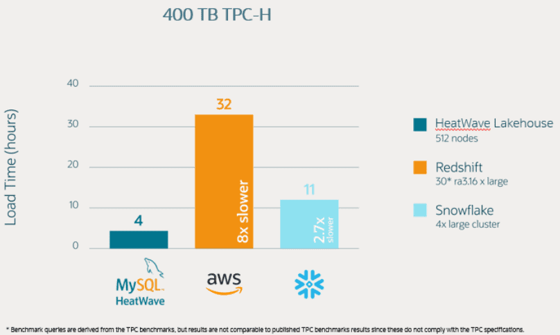 쿼리 성능은 스노우프레이크 보다 17배 빠르고 아마존 레드쉬프트보다 6배 빠르다고 주장했다. 또 오브젝트 스토리지에서 MySQL 히트웨이브레이크하우스로 데이터를 로드하는 경우 400TB TBC-H 워크로드의 상황에서 아마존 레드쉬프트보다 8배 빠르고 스노우 플레이크보다 2.7배 빠르다고 밝혔다.
