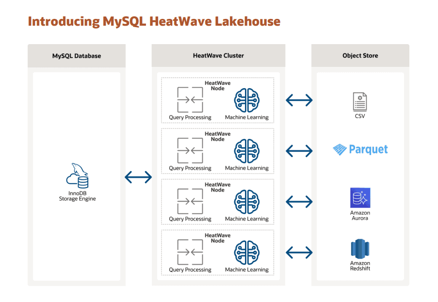 - 다양한 파일 형식 지원: MySQL 히트웨이브 레이크하우스 사용시 고객은 CSV 및 파케이(Parquet)와 같은 다양한 파일 형식으로 저장된 데이터뿐만 아니라 AWS의 오로라 및 레드시프트 백업 자료를 로드하고 처리할 수 있다. 이를 통해 고객은 데이터가 MySQL 데이터베이스에 저장되지 않더라도 MySQL 히트웨이브의 이점을 활용할 수 있다. 쿼리 성능은 데이터가 저장되는 파일 형식에 관계없이 동일하다.