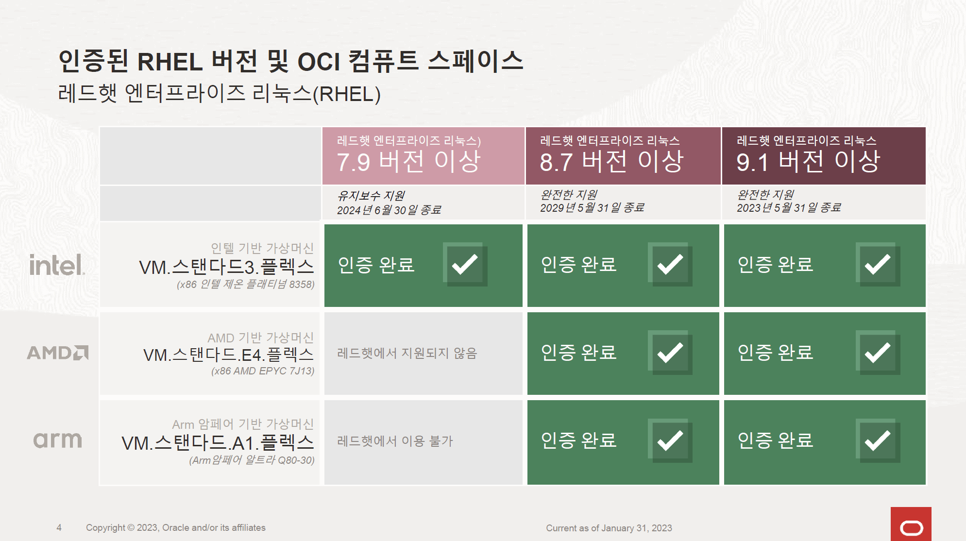 - OCI 기반 레드햇 엔터프라이즈 리눅스 상세정보 확인하기: 오라클 블로그, 레드햇 블로그